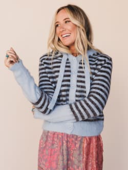 - Fuzzy button-up striped sweater in soft periwinkle and charcoal, complete with a hoodie and tonal ties