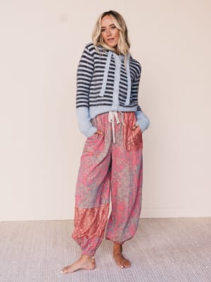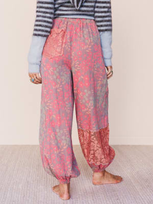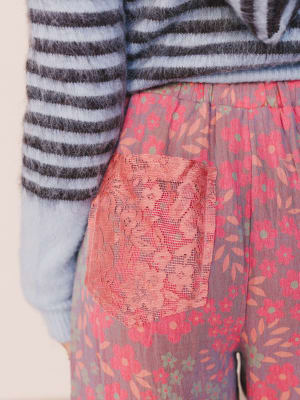 - Wide-leg patchwork pants in soft floral print with lace panels and a relaxed elastic waist