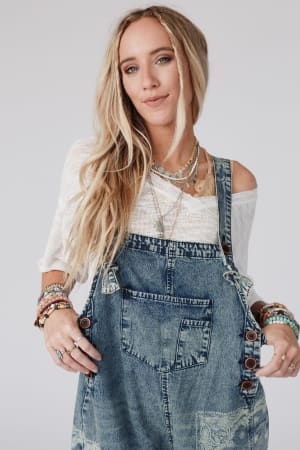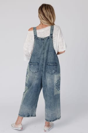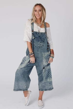 These boho denim overalls feature an oversize silhouette that makes them perfect for a laid-back look.