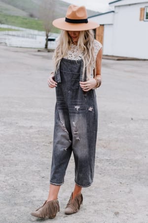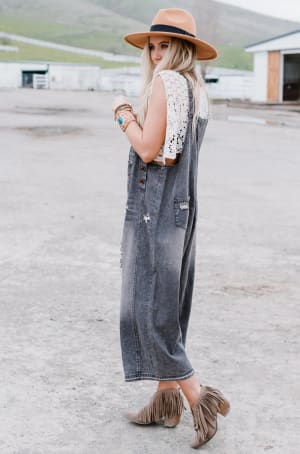 These boho denim overalls feature an oversize silhouette that makes them perfect for a laid-back look.