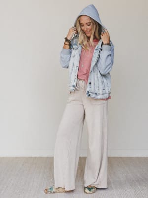 - Detachable hood with a matching drawstring, two flap pockets, and two side pockets.