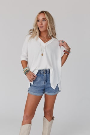 - Dropped shoulders with 3/4 length sleeves for a laid-back and relaxed vibe