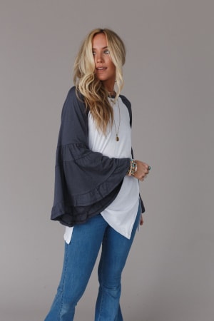 This is the one that has all the fun with the sweet style of a baseball tee, a roomy fit, and tiered flounce in these boho-chic bell sleeves. Soft knit is just right for this tunic length tee with side-slits and classic contrast at the crewneck band.