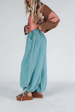 Parachute pants aren’t going anywhere. Get in on this timely trend with the Cool Coast Wide Leg Pants in gorgeous teal.
