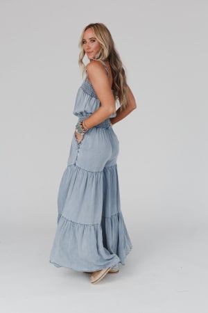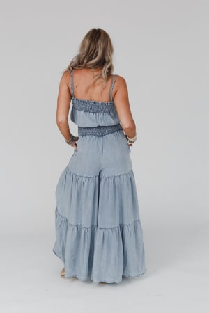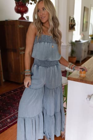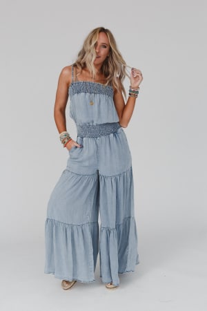 Elevate your boho style with our Harlow Wide Leg Chambray Jumpsuit - it’s the ultimate boho-chic piece for any occasion!