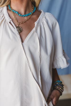 This ruffled boho top looks amazing with bell bottom jeans for a retro look.