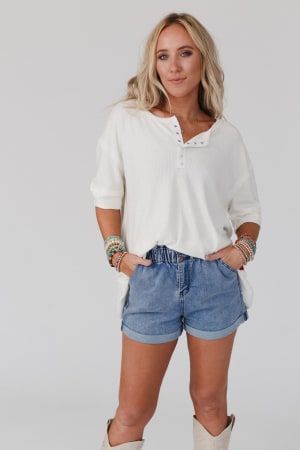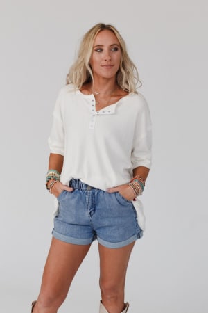 - Henley snap button front closure (perfect to show off your cute bralettes!)