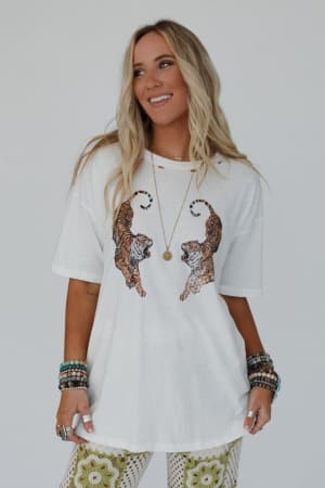 Take a walk on the wild side in this boho graphic tee featuring twin tigers and a relaxed fit.