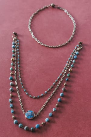 • Bronze chains, turquoise and bronze beads of various sizes, and statement turquoise pendant