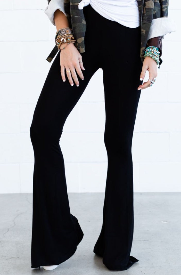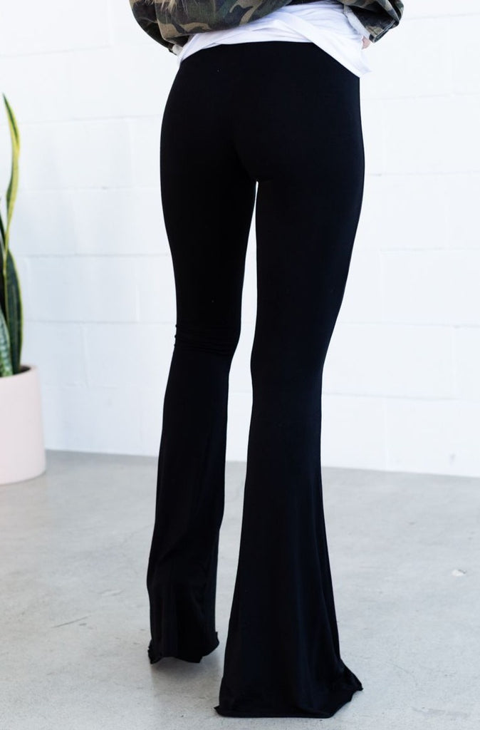 - LARGE: Waist: 28", Inseam: 33 5/8", Length: 43 5/8," Rise: 12," Flare 15"