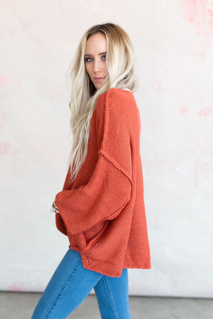 Snuggle up in a chunky boho sweater like the Crisp Air pullover. Thick, seam detailing and a fun double-hem has a bit of open-stitch detail at the notches in the sides. This modern, boxy-fit has wide cuffs and comfy Dolman-style sleeves.
