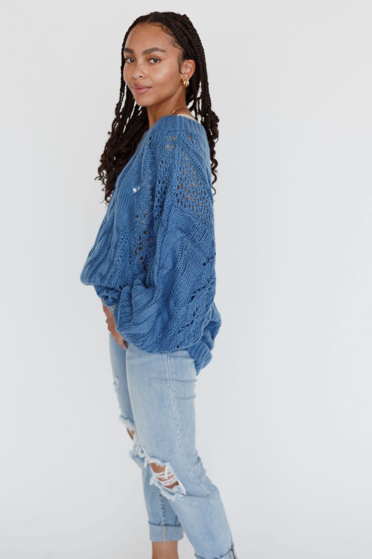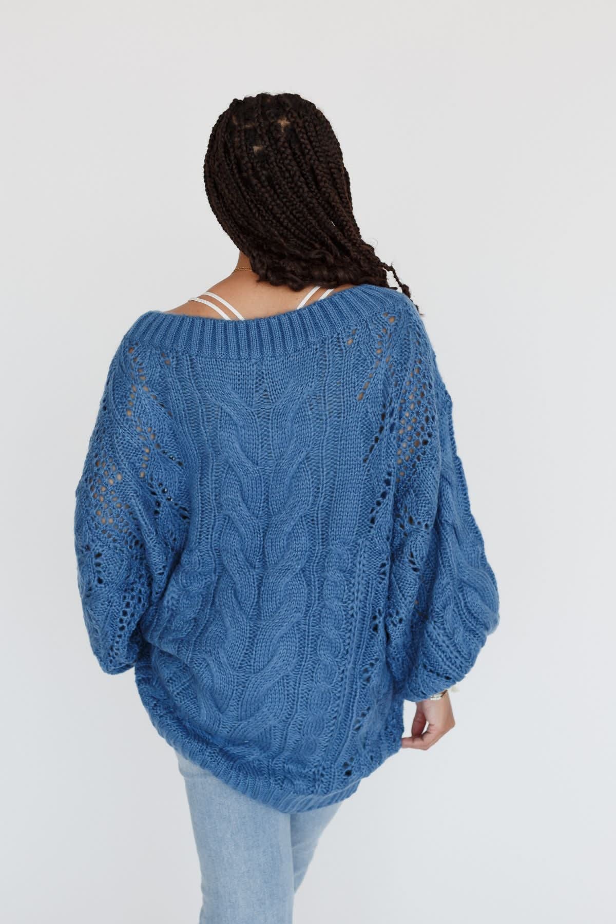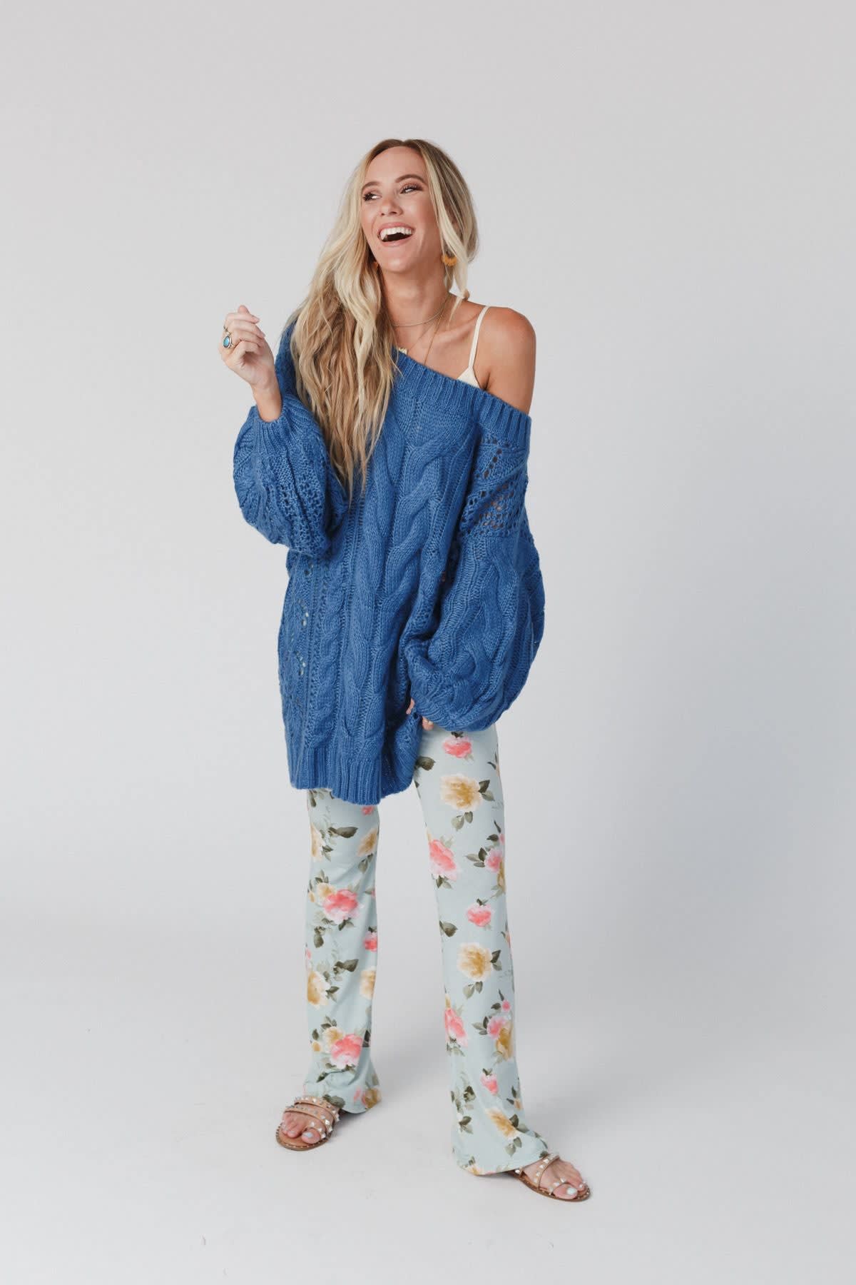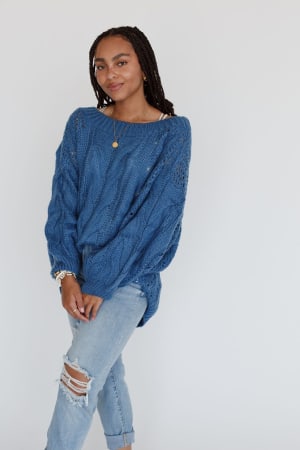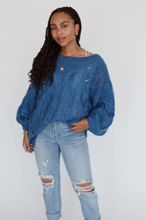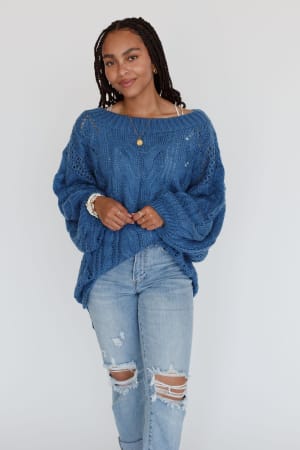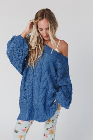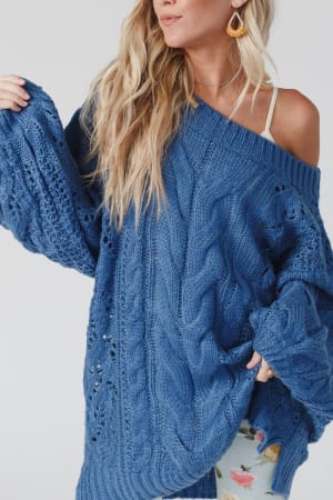 A coveted, chunky sweater is ready for anything with stylish balloon-sleeves and comfy drop-shoulders that can easily be worn off-the-shoulder. This length pairs well with leggings or with a front-tuck into jeans. Snuggly cable-knit warms the spirit when the weather gets frosty.