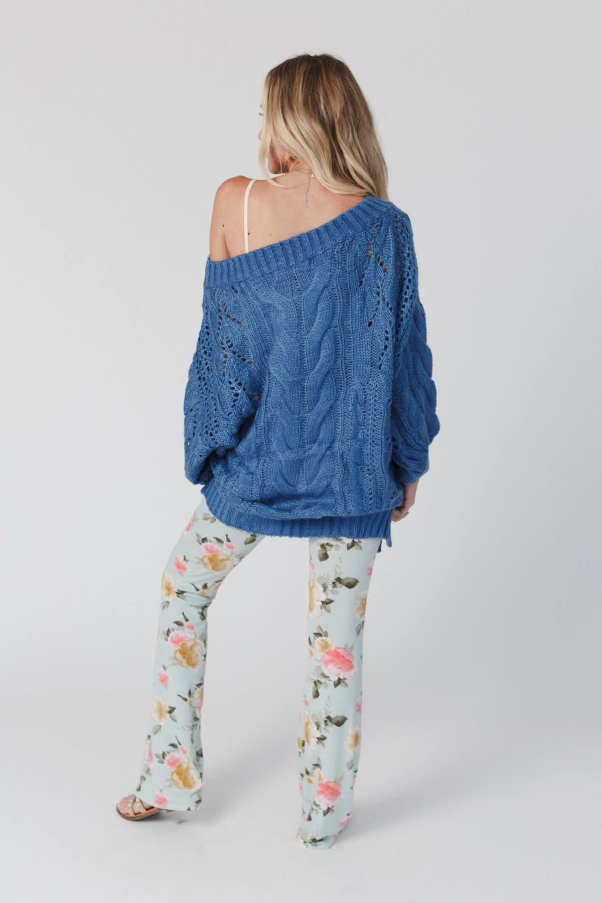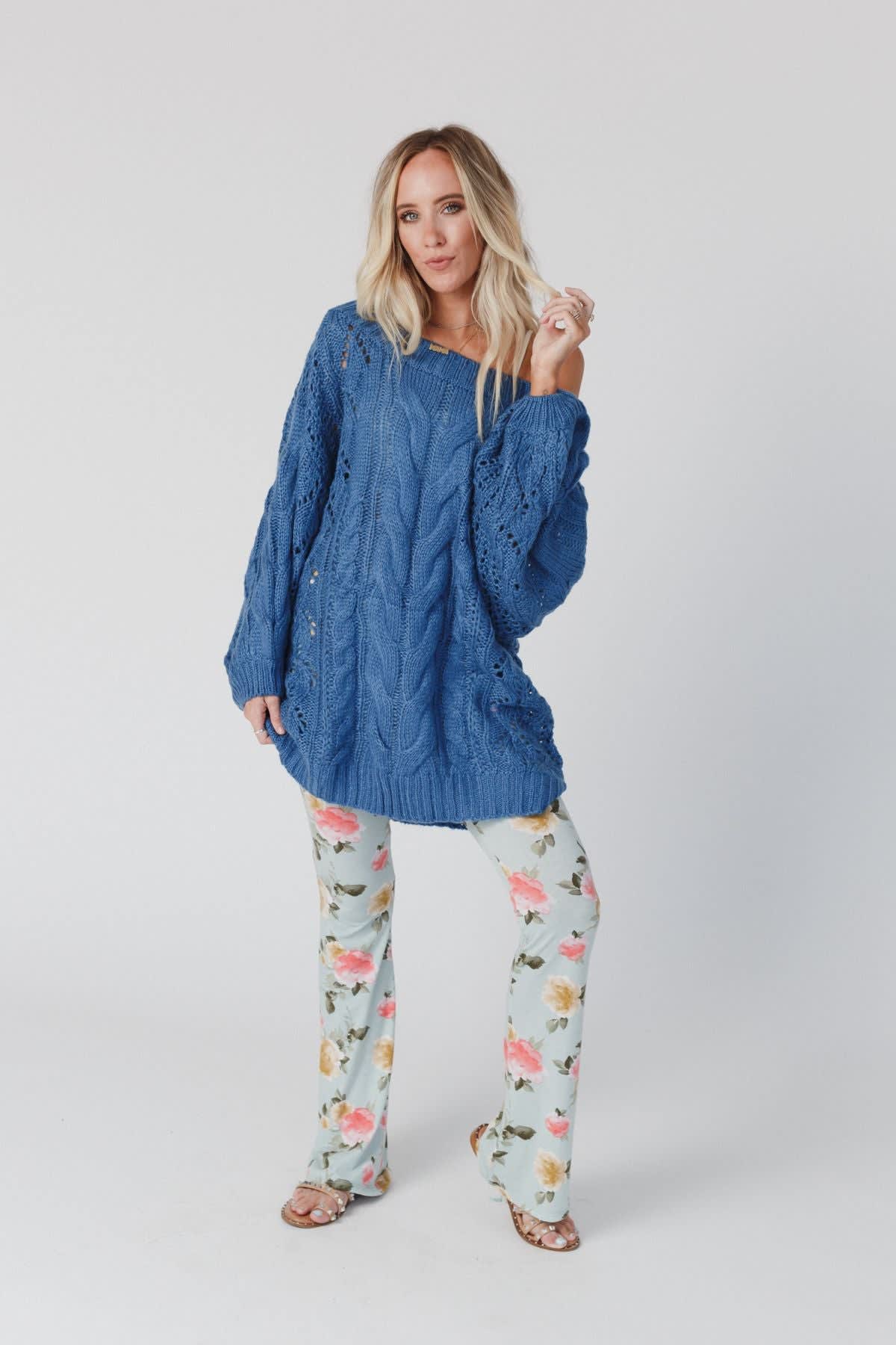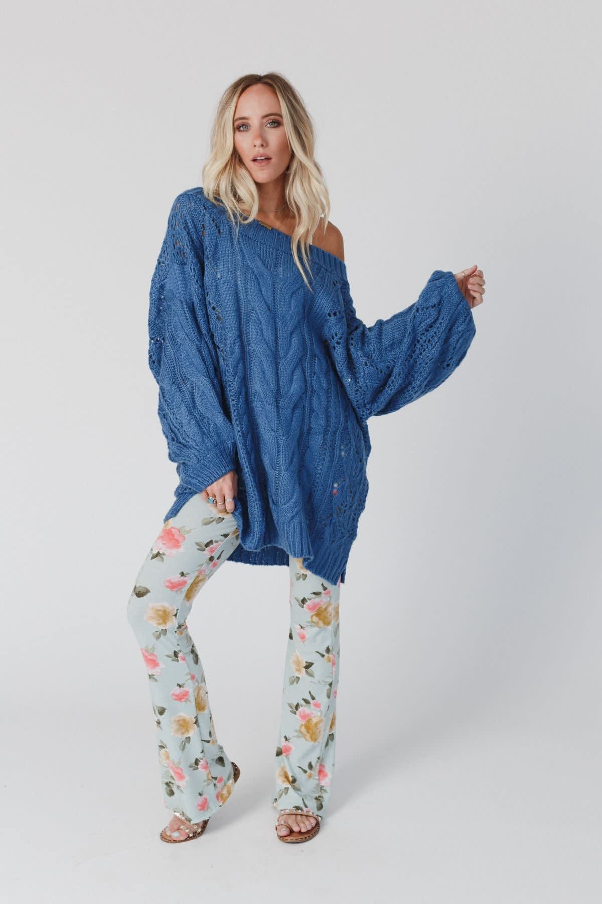 A coveted, chunky sweater is ready for anything with stylish balloon-sleeves and comfy drop-shoulders that can easily be worn off-the-shoulder. This length pairs well with leggings or with a front-tuck into jeans. Snuggly cable-knit warms the spirit when the weather gets frosty.