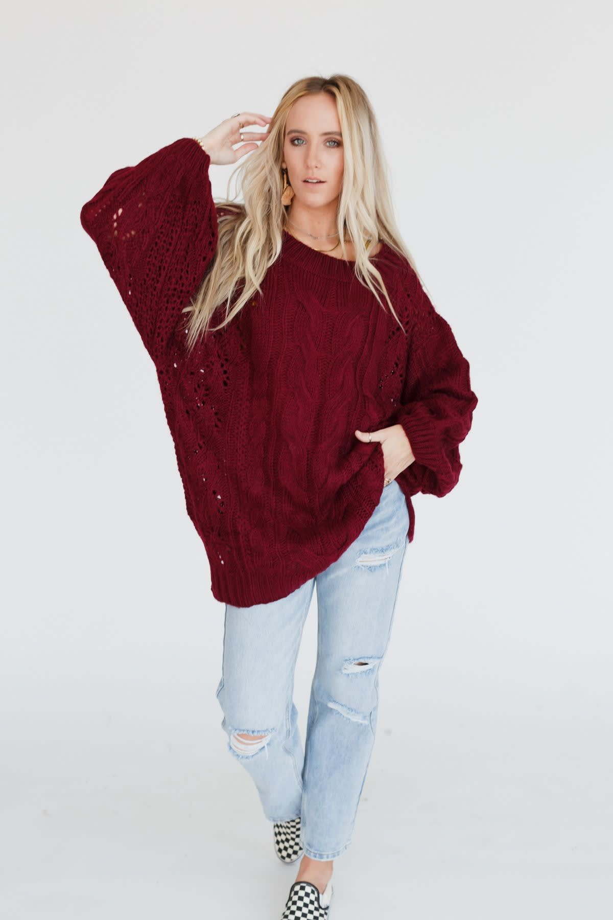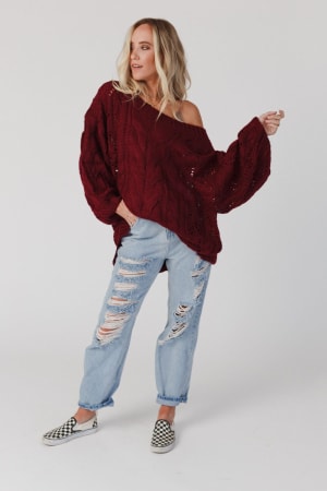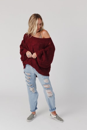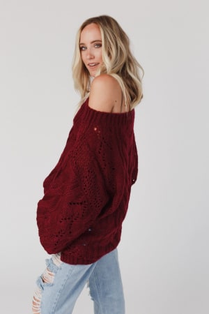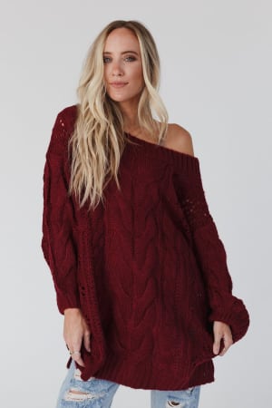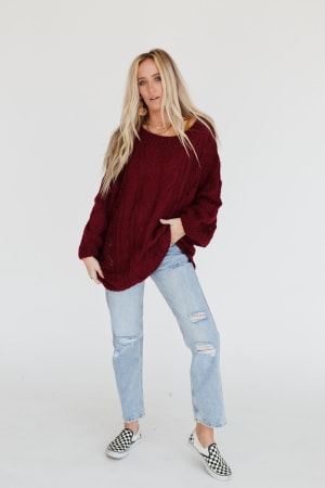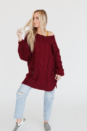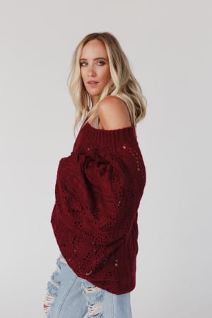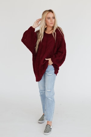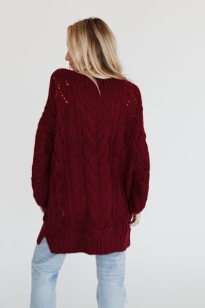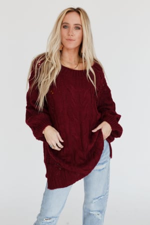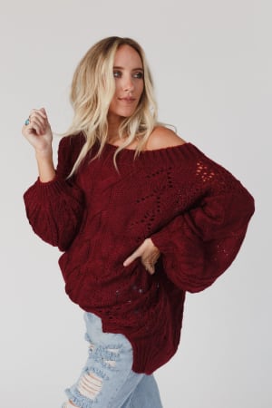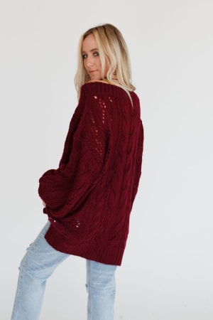 A coveted, chunky sweater is ready for anything with stylish balloon-sleeves and comfy drop-shoulders that can easily be worn off-the-shoulder. This length pairs well with leggings or with a front-tuck into jeans. Snuggly cable-knit warms the spirit when the weather gets frosty.