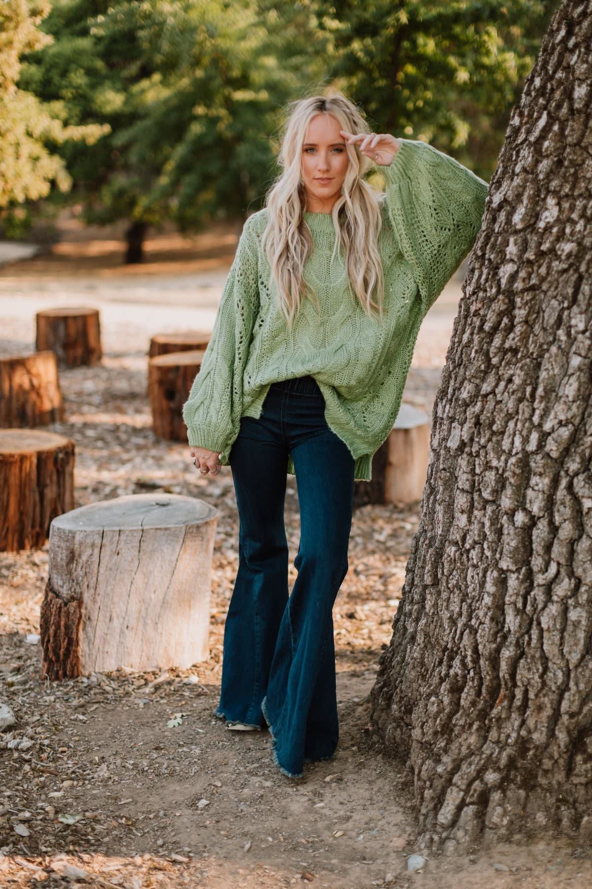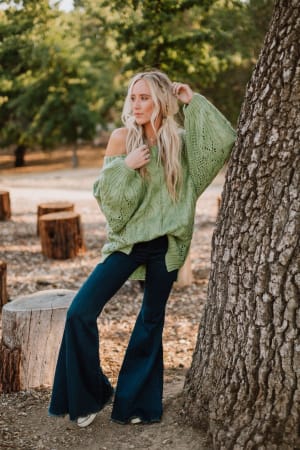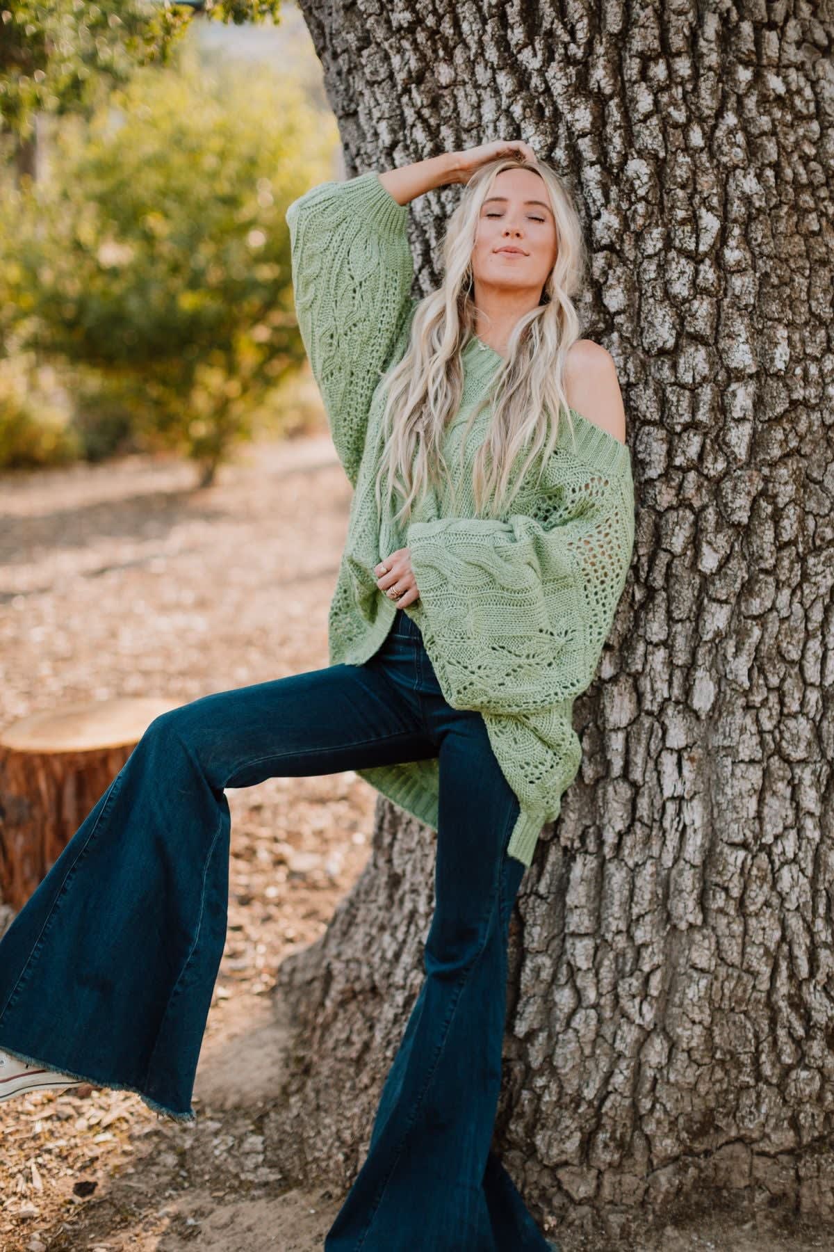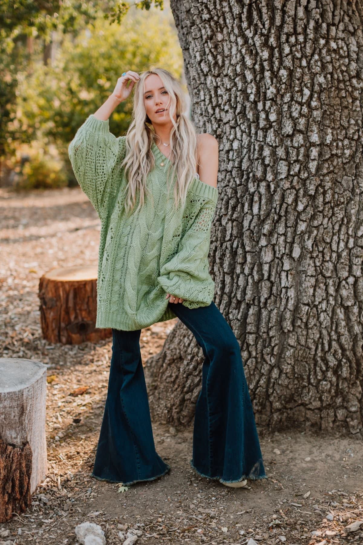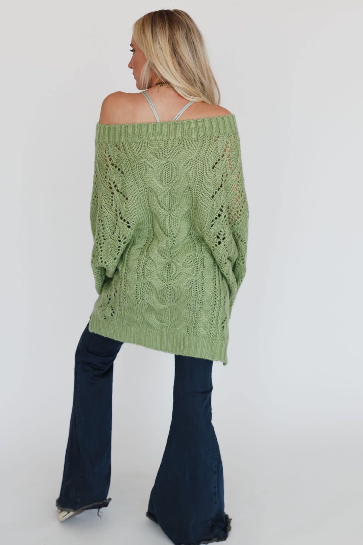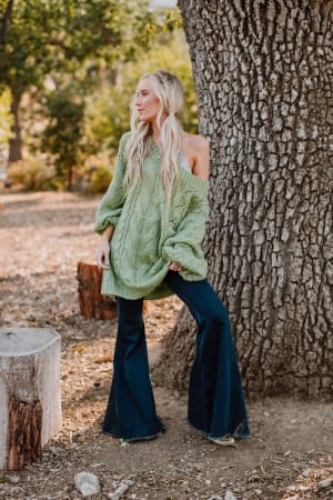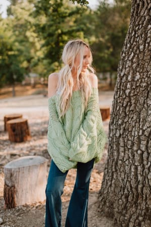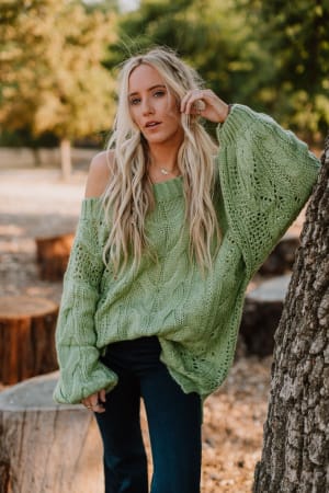 A coveted, chunky sweater is ready for anything with stylish balloon-sleeves and comfy drop-shoulders that can easily be worn off-the-shoulder. This length pairs well with leggings or with a front-tuck into jeans. Snuggly cable-knit warms the spirit when the weather gets frosty.