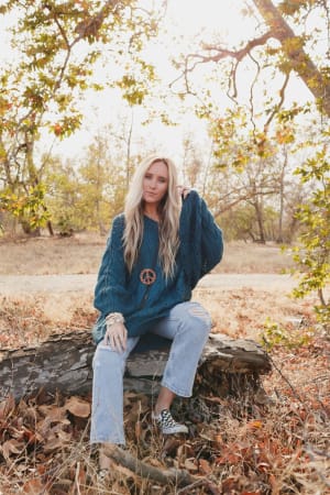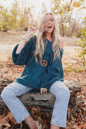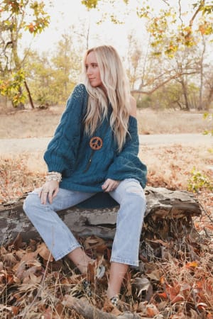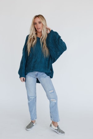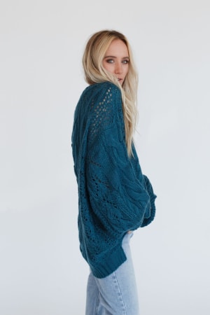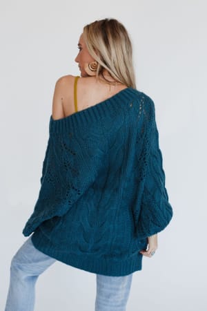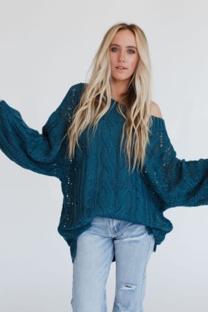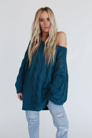 A coveted, chunky sweater is ready for anything with stylish balloon-sleeves and comfy drop-shoulders that can easily be worn off-the-shoulder. This length pairs well with leggings or with a front-tuck into jeans. Snuggly cable-knit warms the spirit when the weather gets frosty.