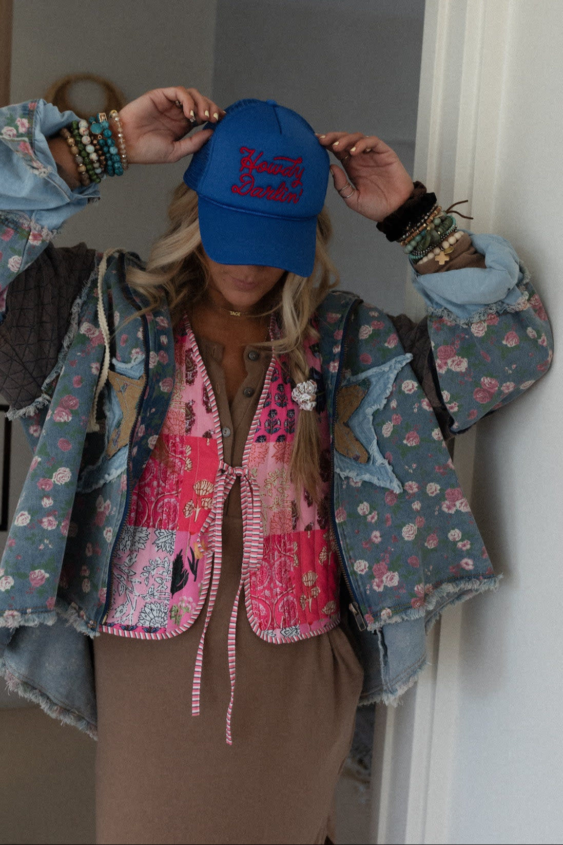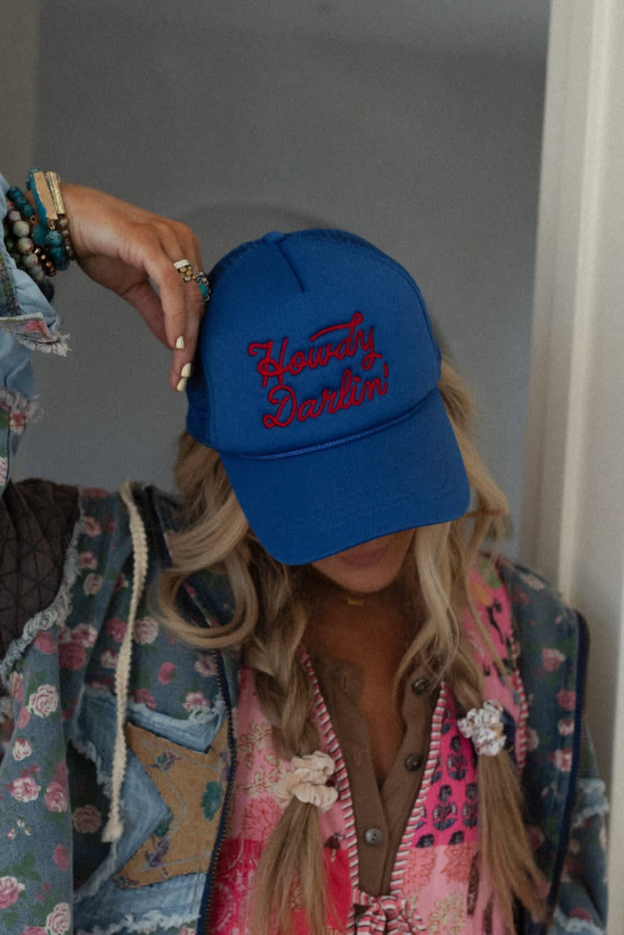- Howdy Darlin’ Trucker Hat – Add a western wink to your look with this bold blue trucker hat featuring retro red embroidery. It’s your new favorite statement topper.