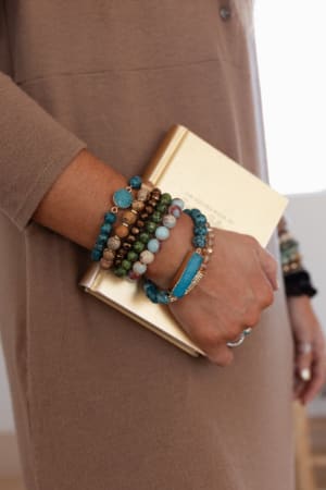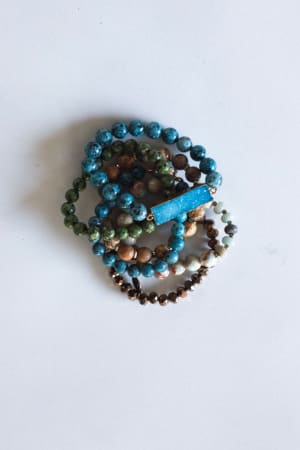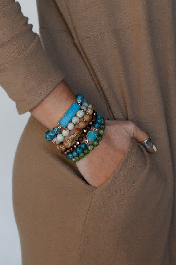 - Blue Lagoon Bracelet Set – Stacked beaded bracelets in earthy tones with a flash of turquoise bring grounding energy and playful texture to any outfit.
