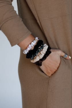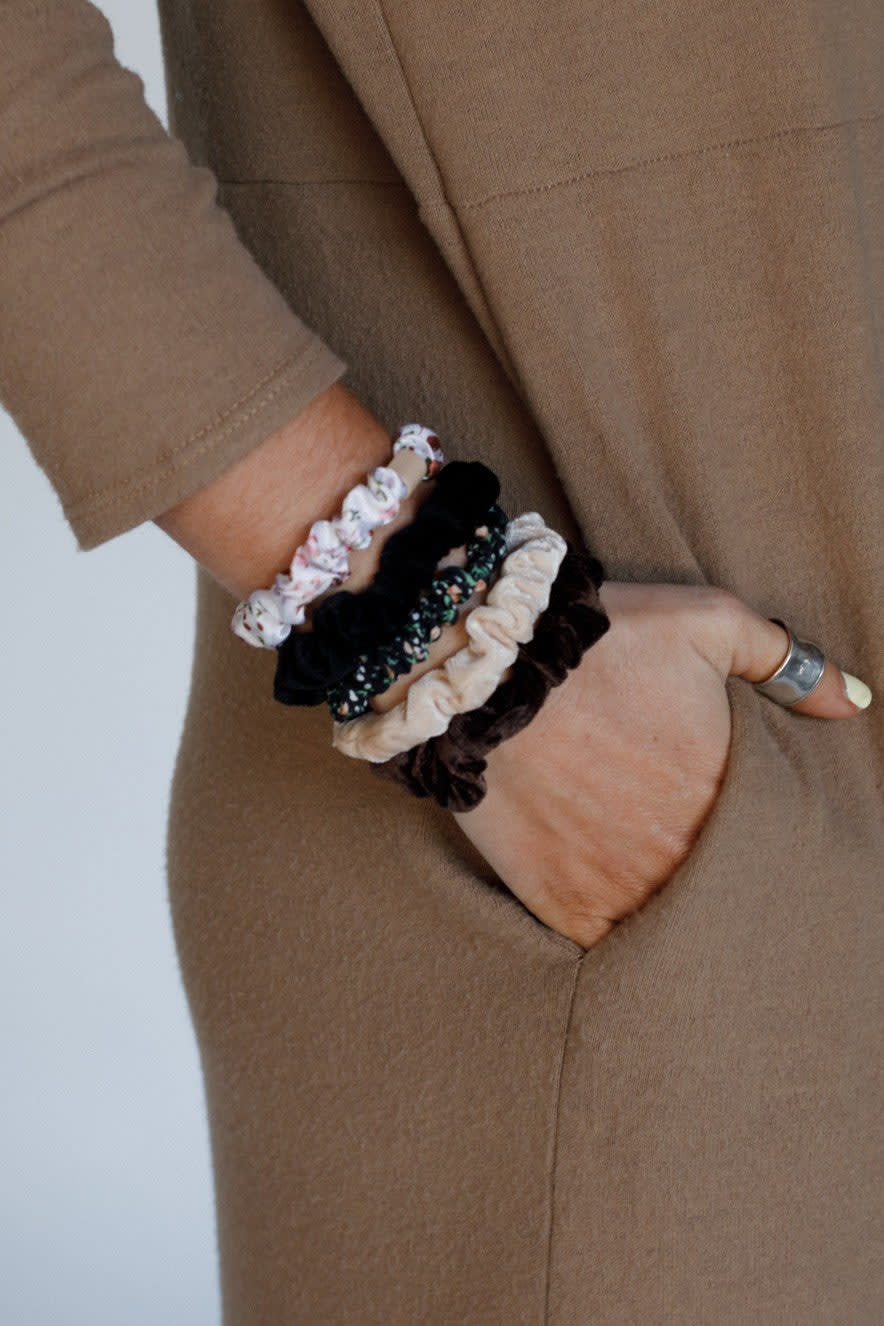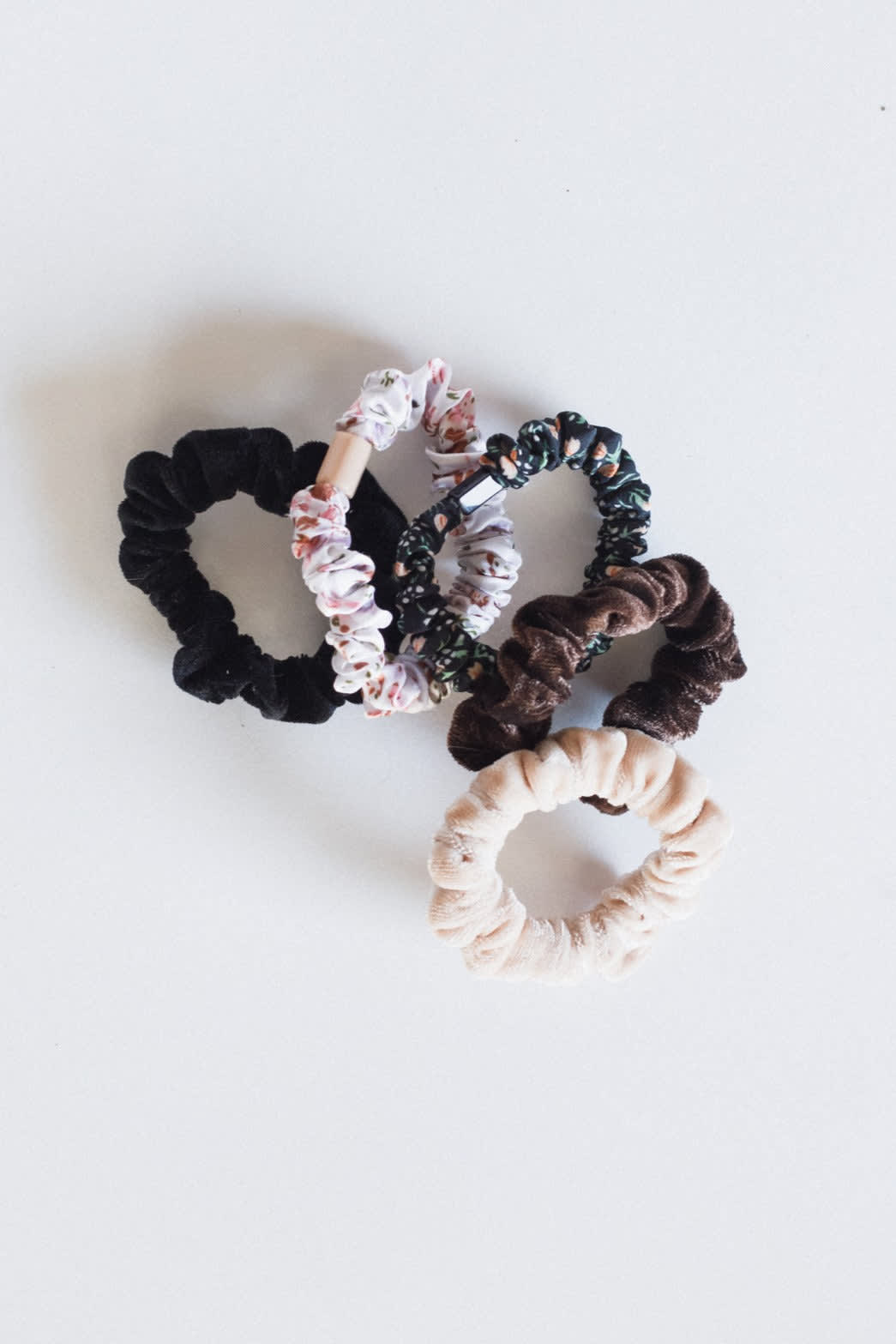 - Velvet Crush Hair Scrunchies – A mix of plush velvet and floral prints make these scrunchies the perfect wrist candy or ponytail pop. Stack them or share with your besties!