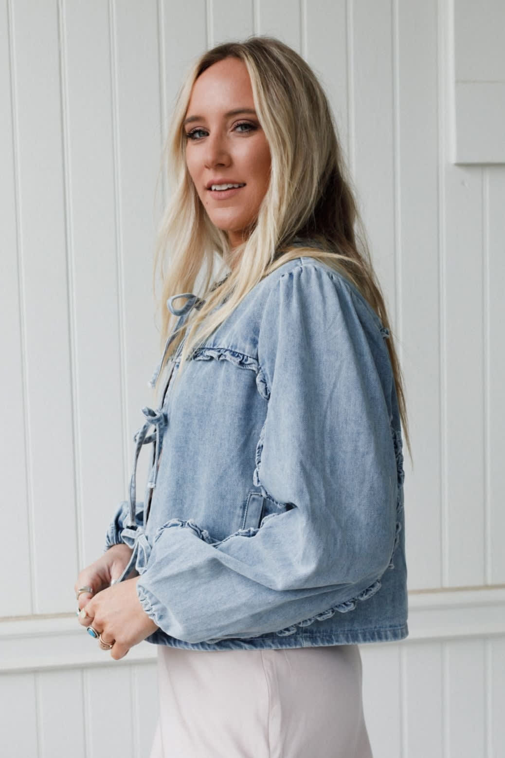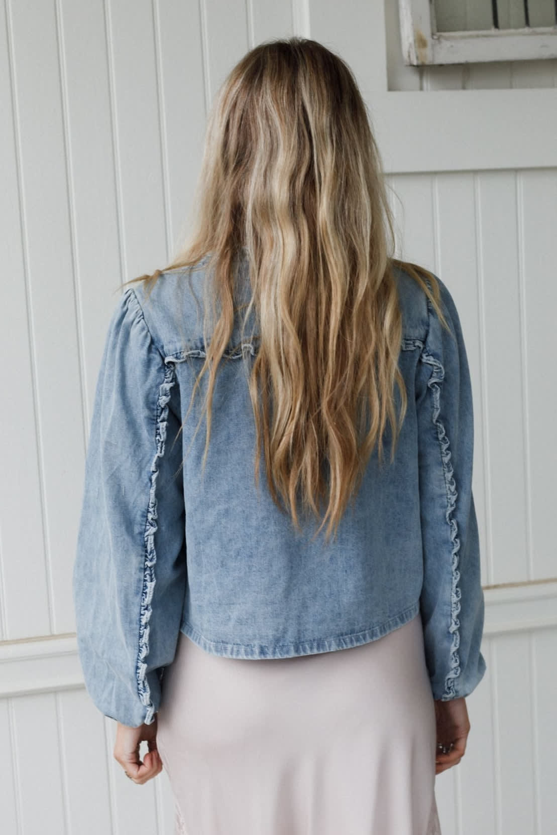 Add this darling ruffle denim jacket to any look for an ultra-femme accent.