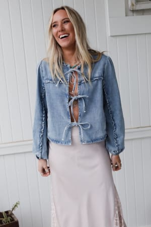 Add this darling ruffle denim jacket to any look for an ultra-femme accent.