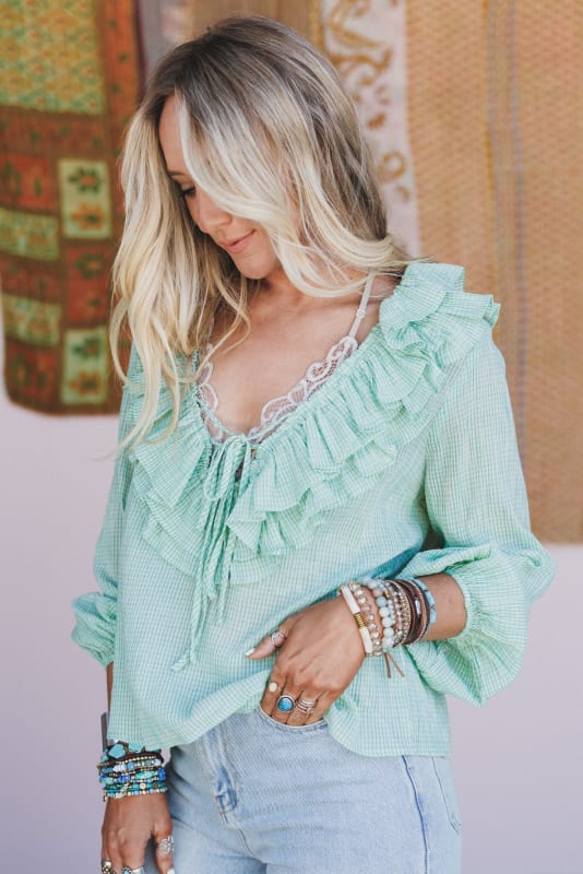 Pair this ruffled top with a denim mini skirt and western boots for a cute casual look.