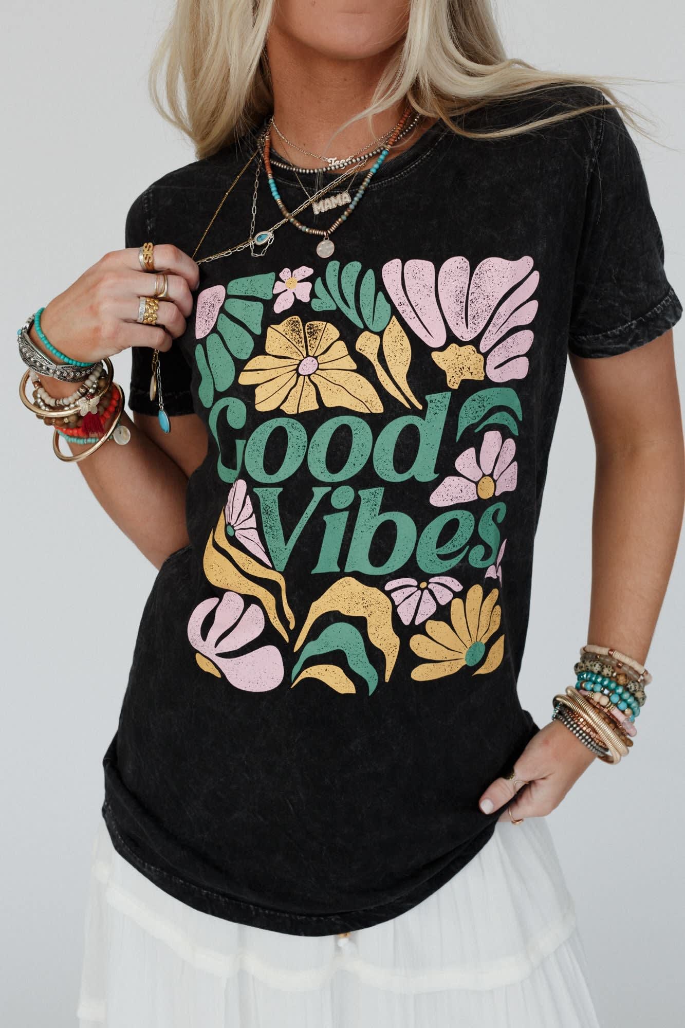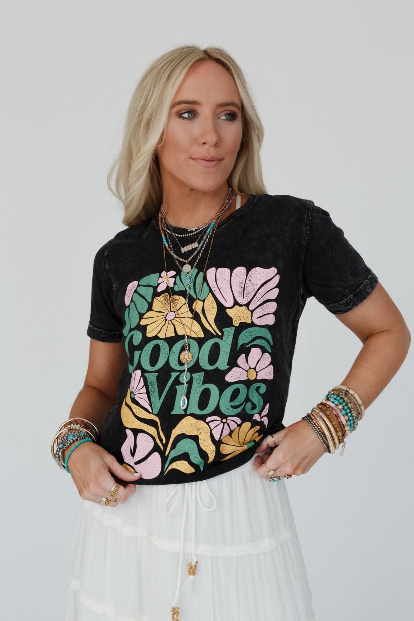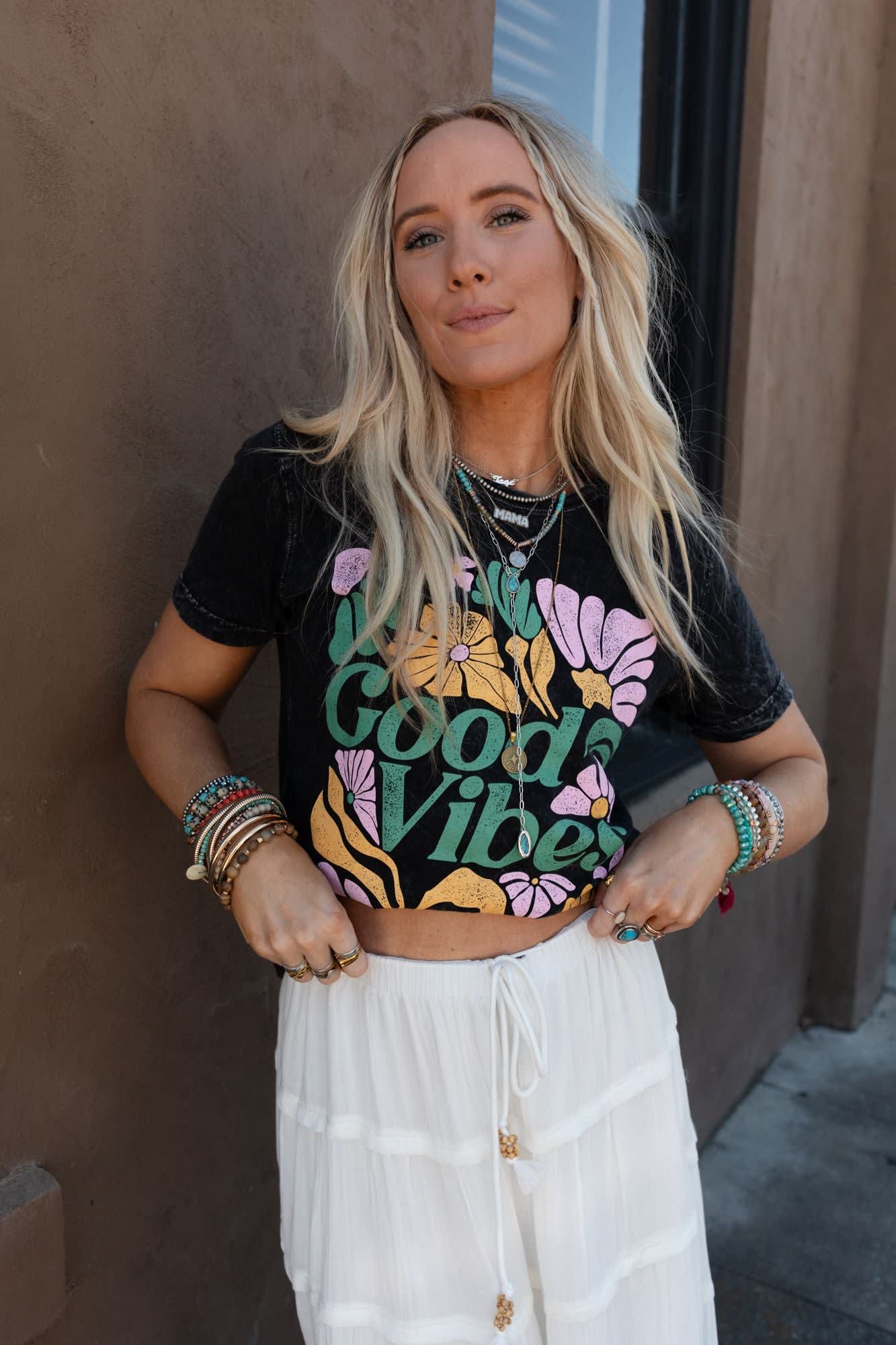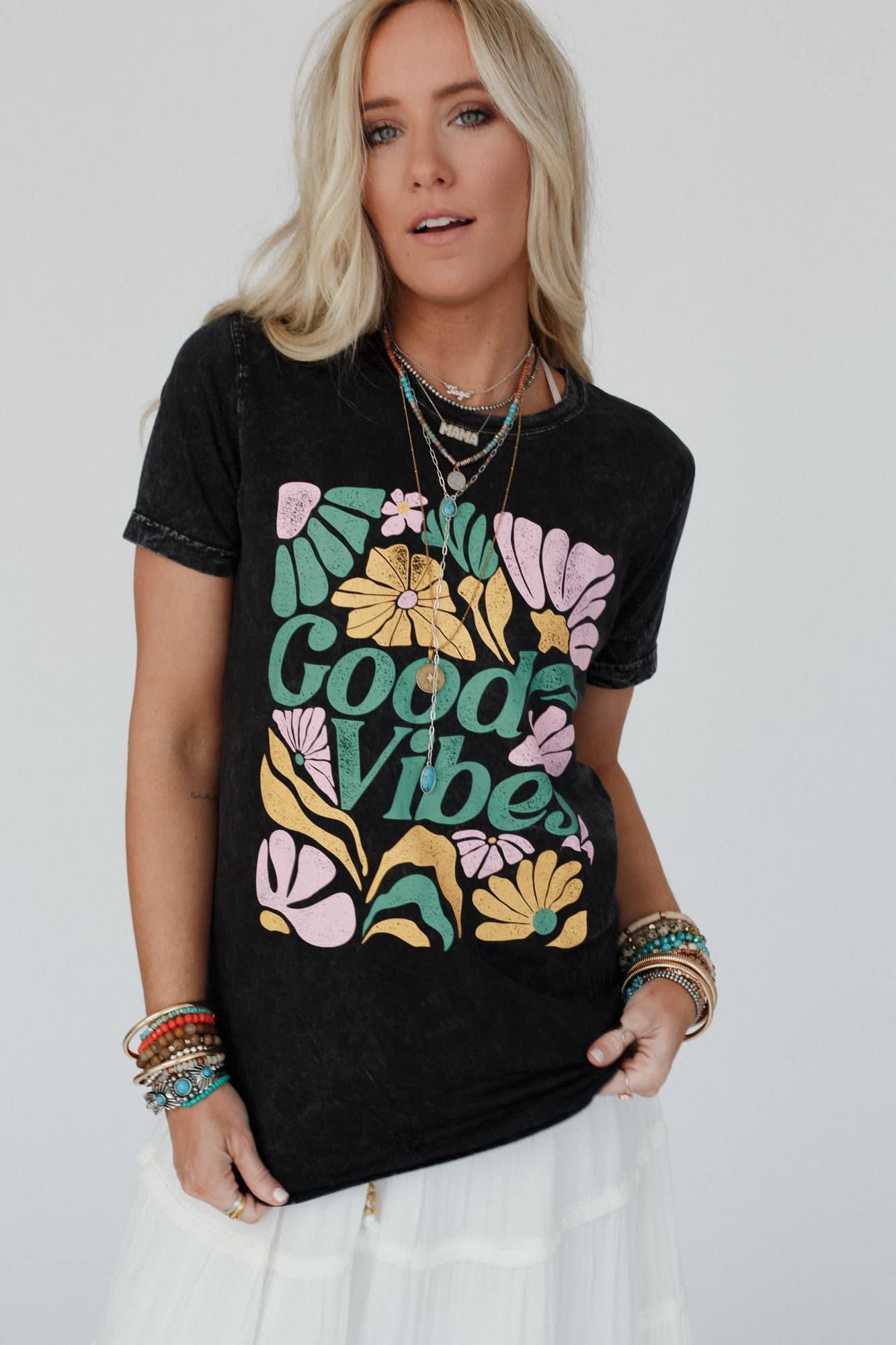 Your new favorite graphic tee just arrived, the All Good Vibes Graphic Tee is the perfect essential to your boho closet!