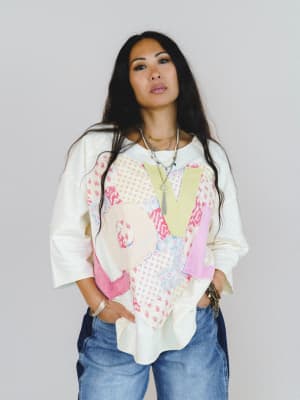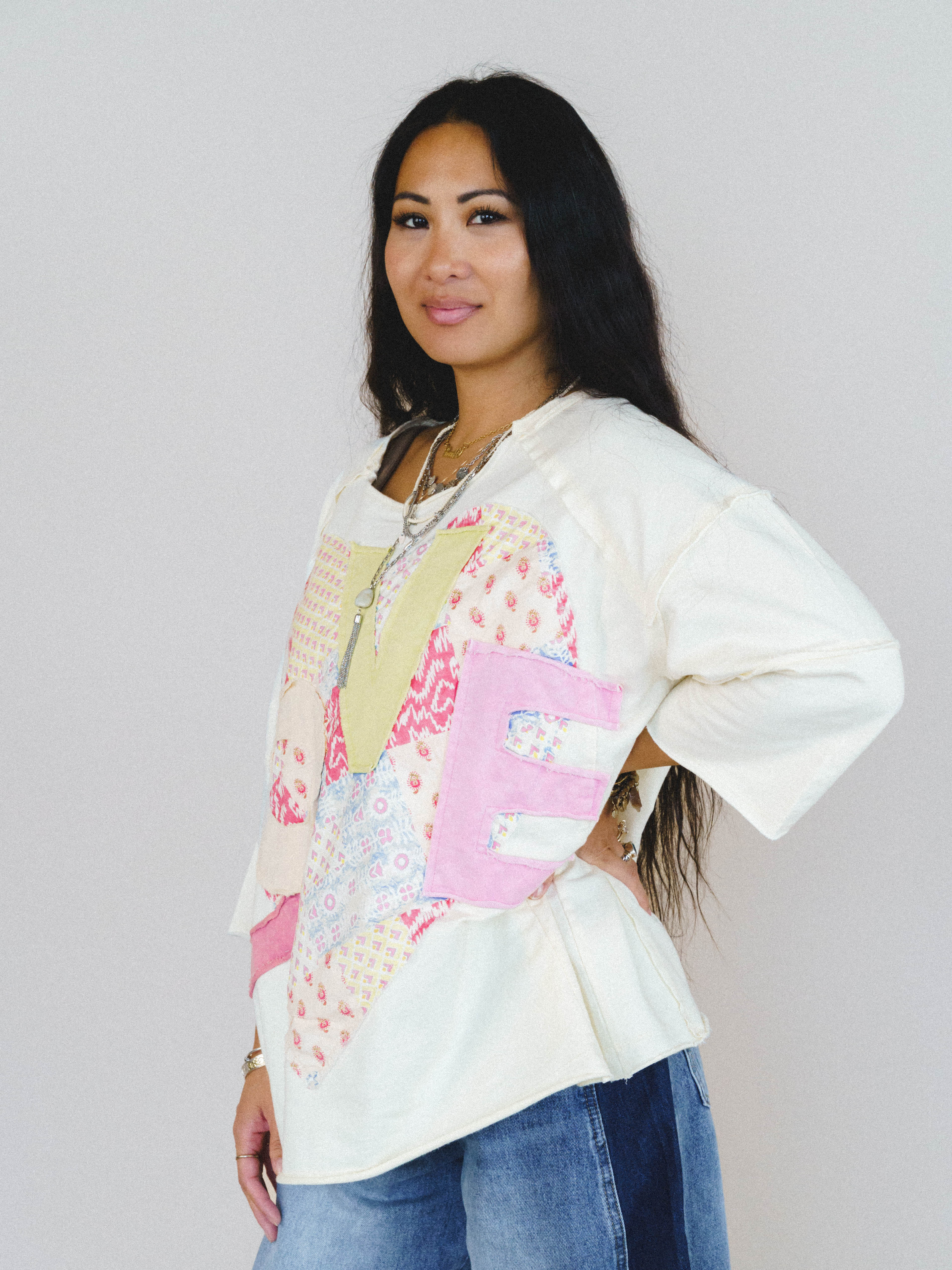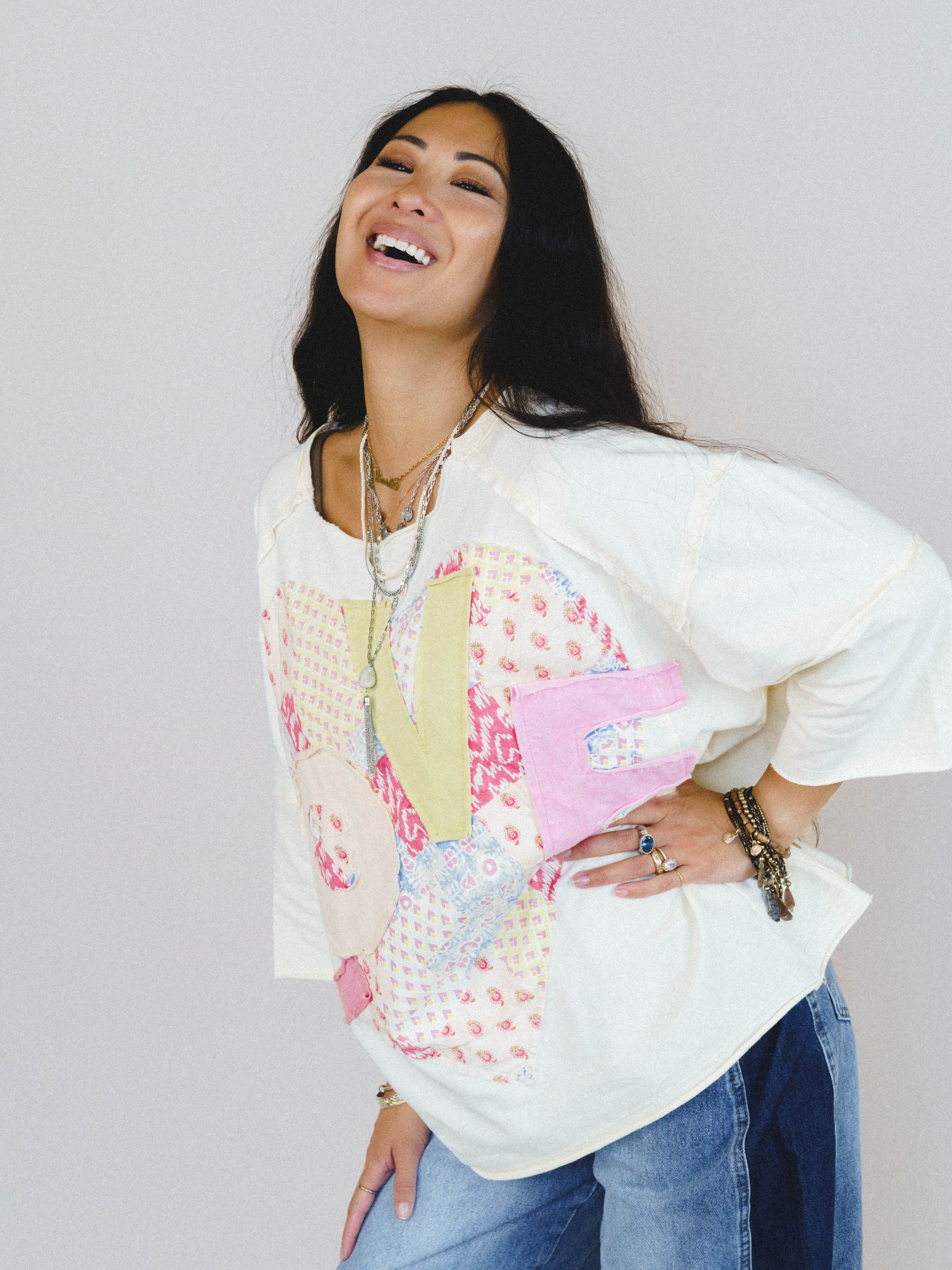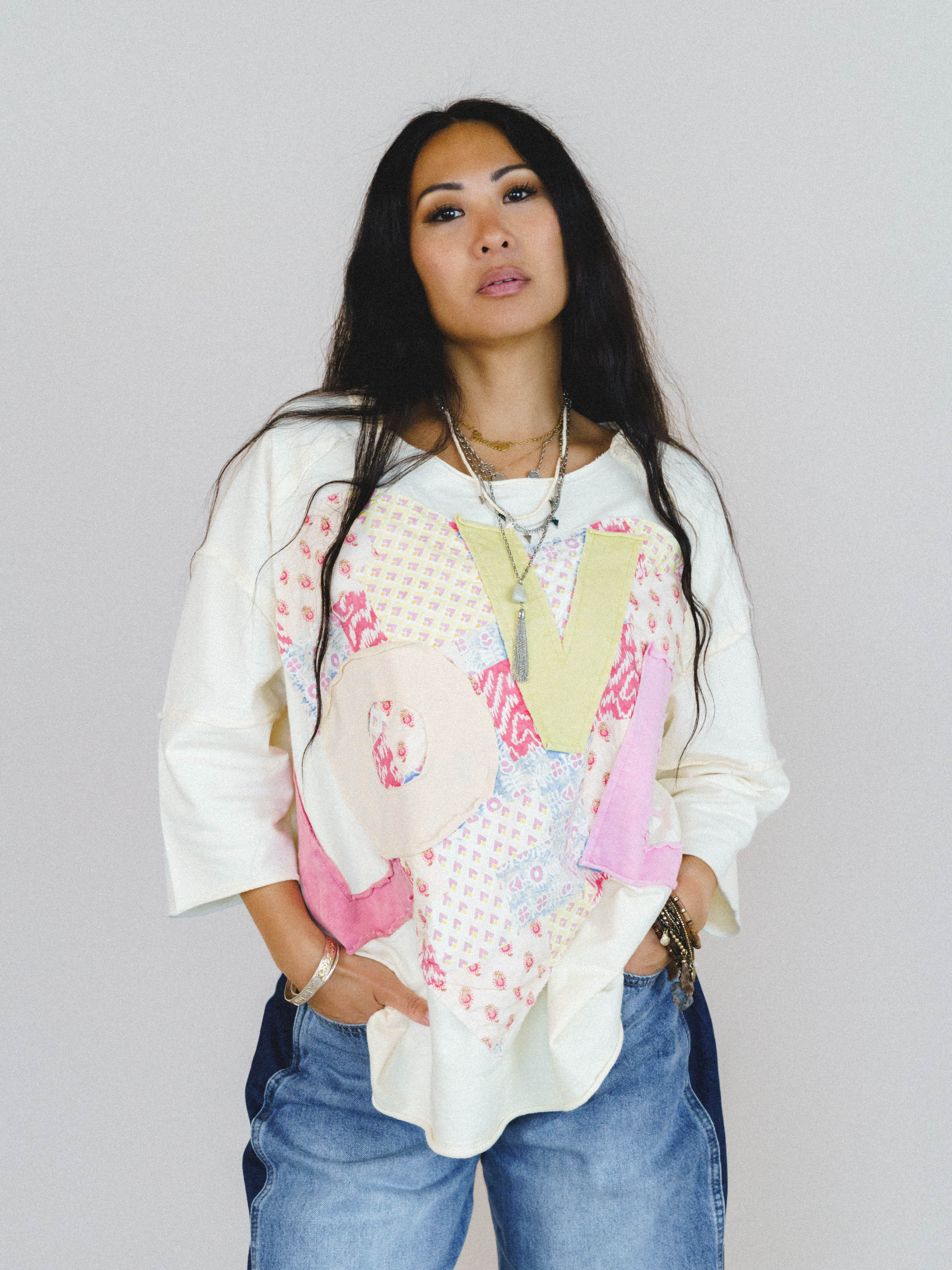 This patchwork statement tee is exactly what you need for festival outfits that radiate free-spirited style and bohemian fashion vibes. The eye-catching patchwork design features mixed floral and geometric prints that create an artistic love-themed graphic perfect for boho clothing enthusiasts.