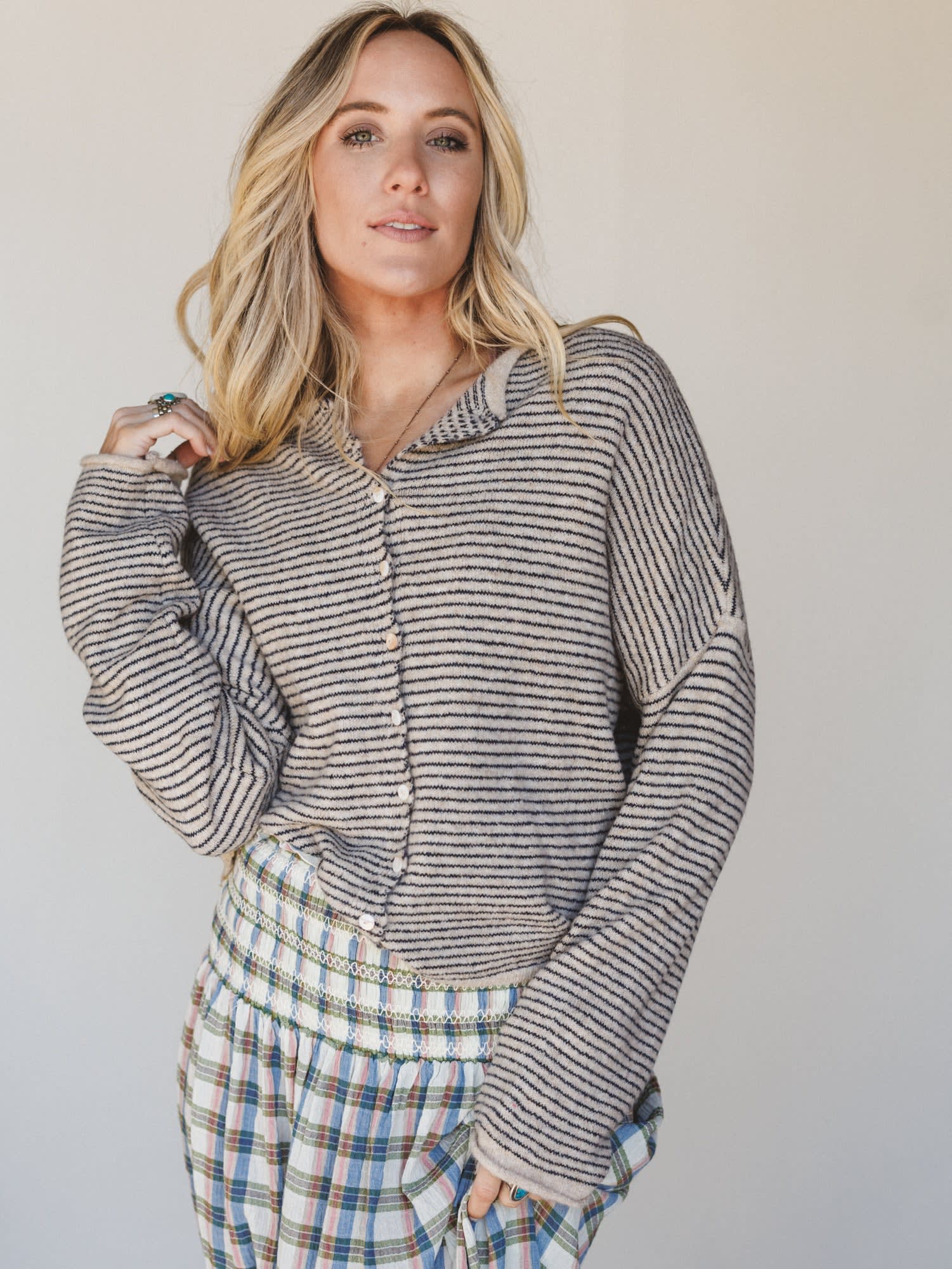 • Lightweight knit cardigan in a soft oatmeal and charcoal stripe for an easy neutral look