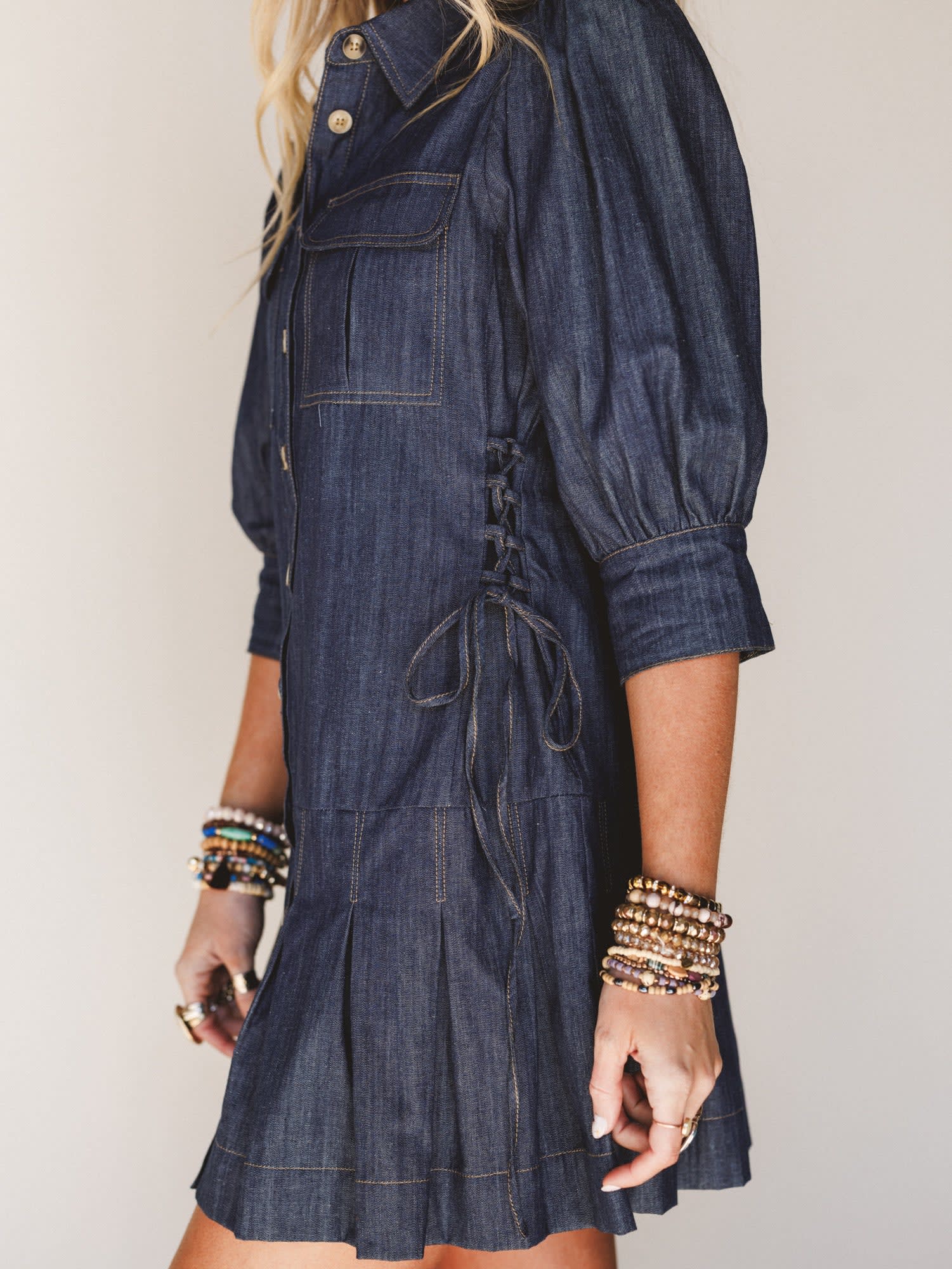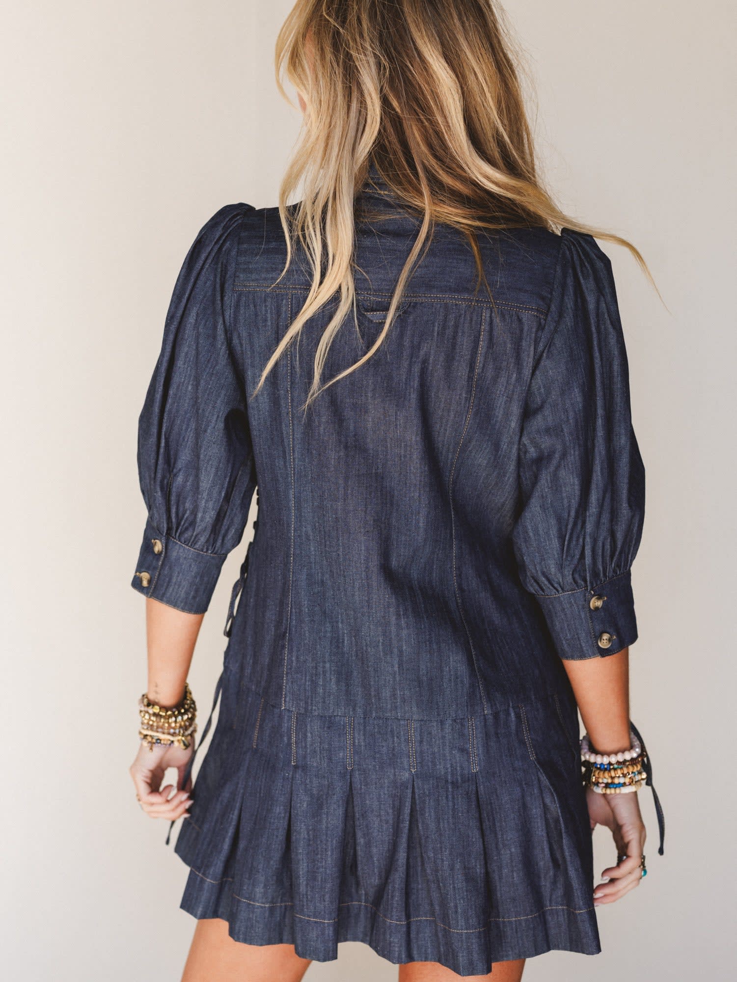 Soft dark wash denim mini dress with a structured yet comfortable feel