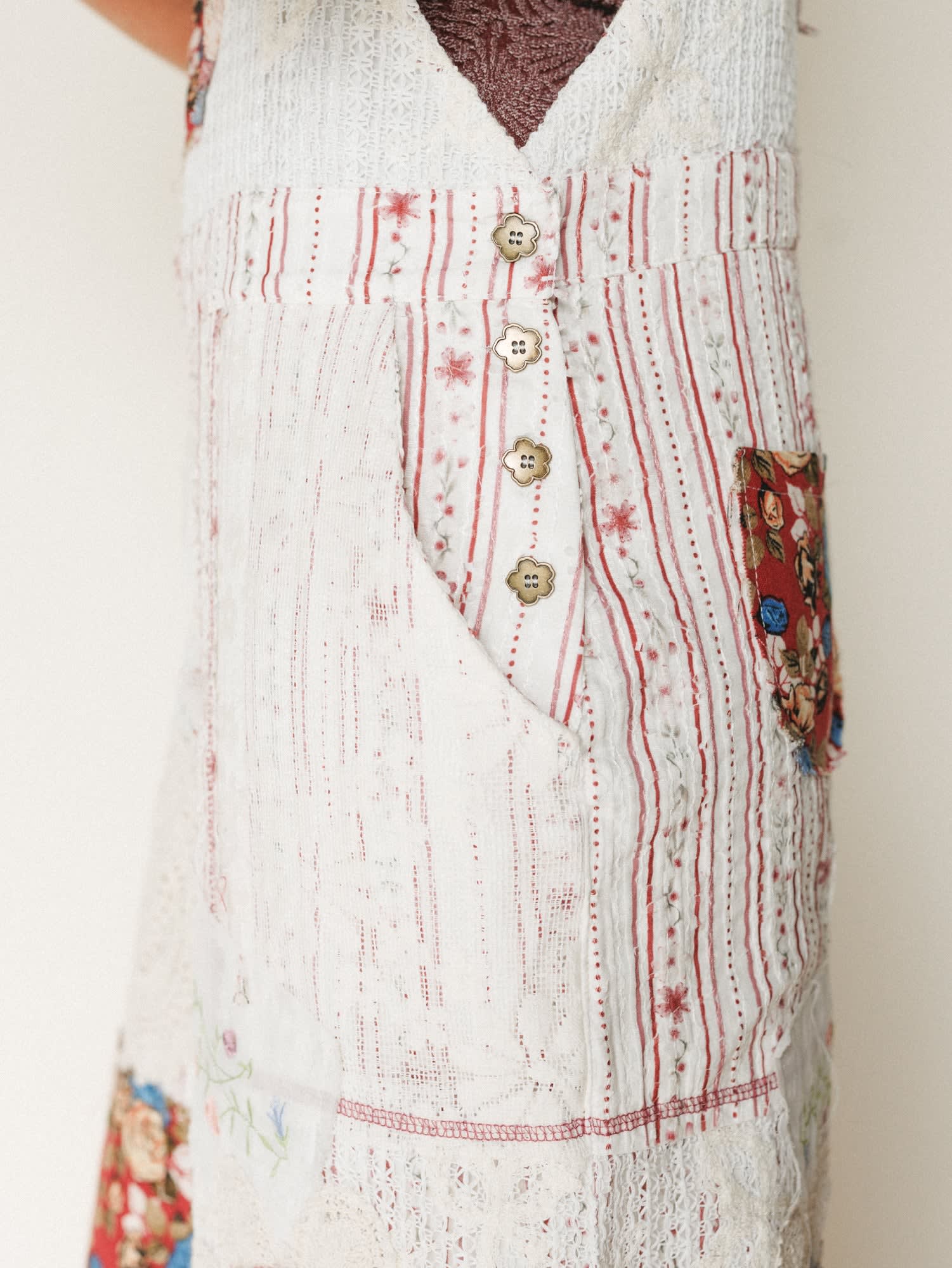 Functional pockets and unique mixed fabric details add artisan charm and everyday practicality