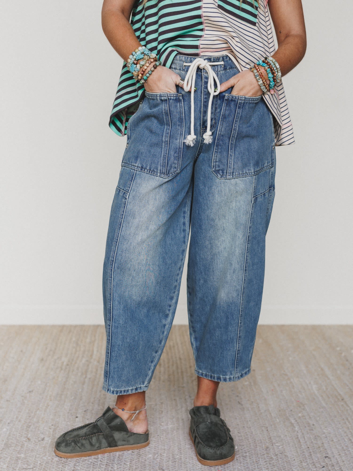 - Relaxed barrel-leg silhouette