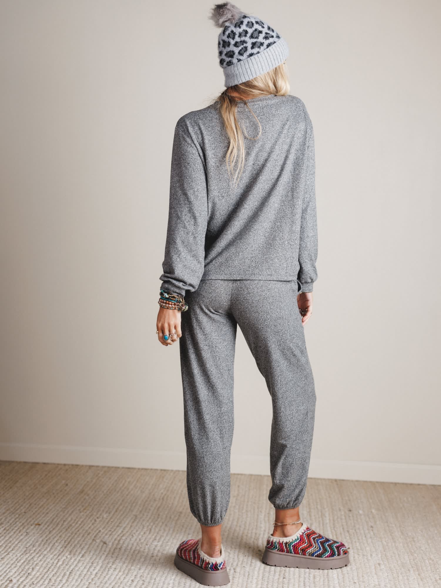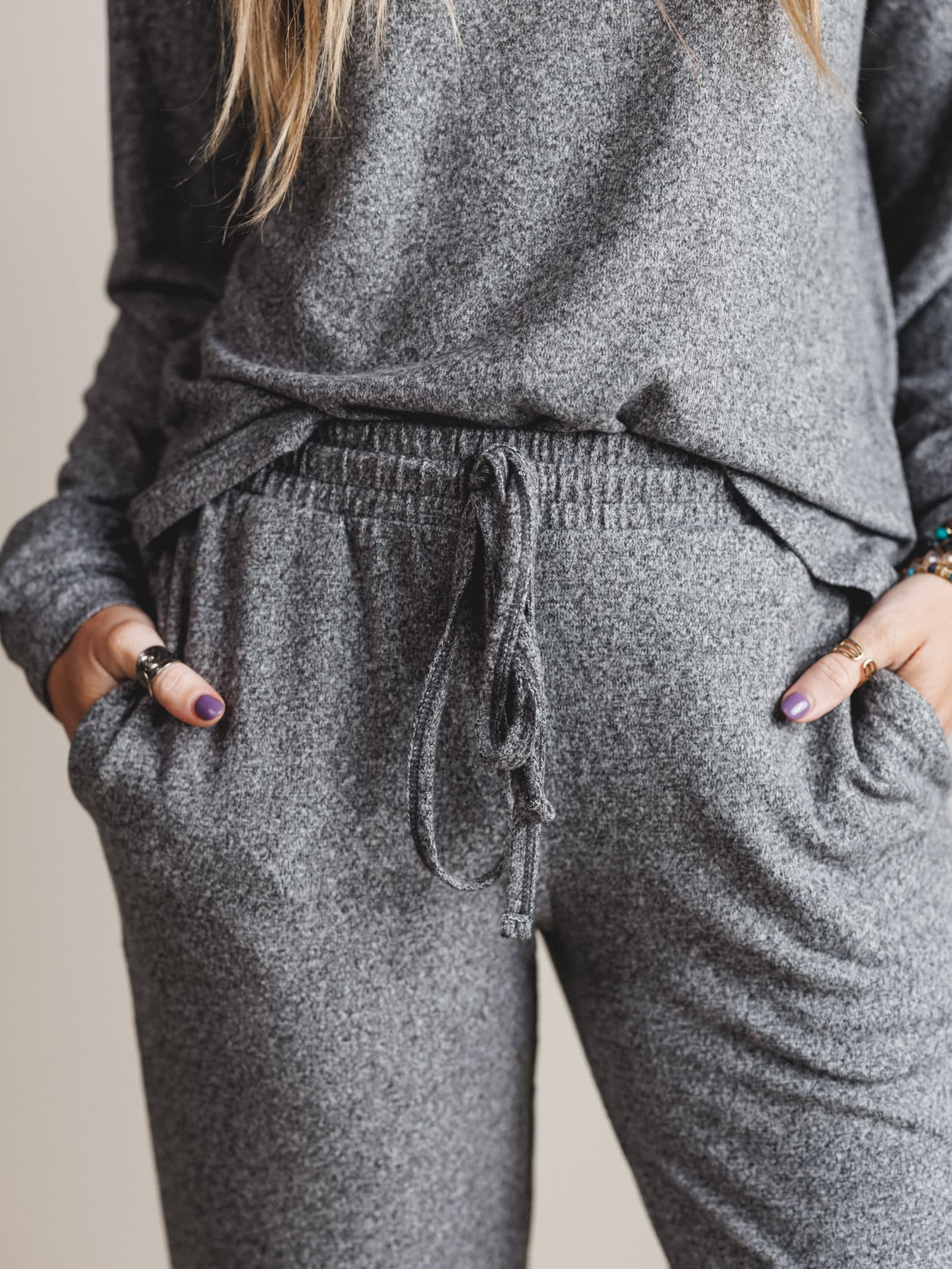 - Lounge set features a soft brushed knit top and matching joggers with a drawstring waist