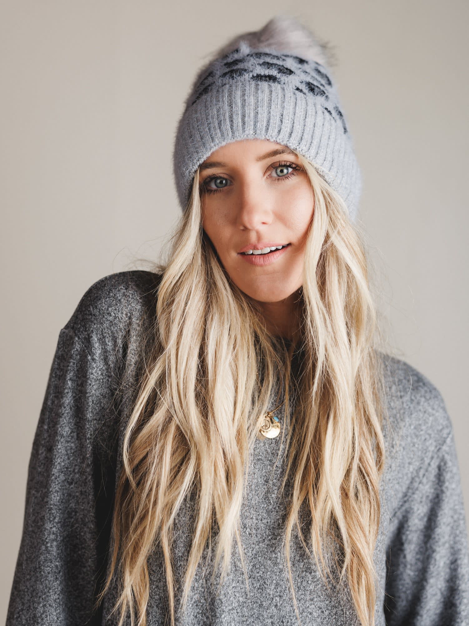 - Leopard print beanie with a faux fur pom adds a pop of cozy personality