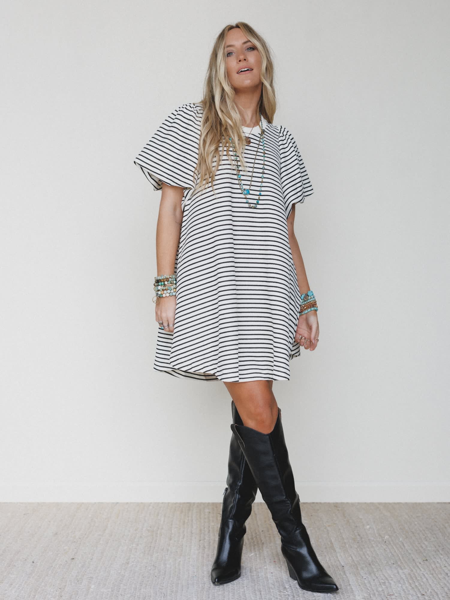 If you’re looking for an easy brunch outfit or the perfect casual dress to throw on with boots, this striped cutie is ready to go. It’s the kind of effortless piece you can wear to a coffee date, weekend market, or casual country concert and feel instantly put together.