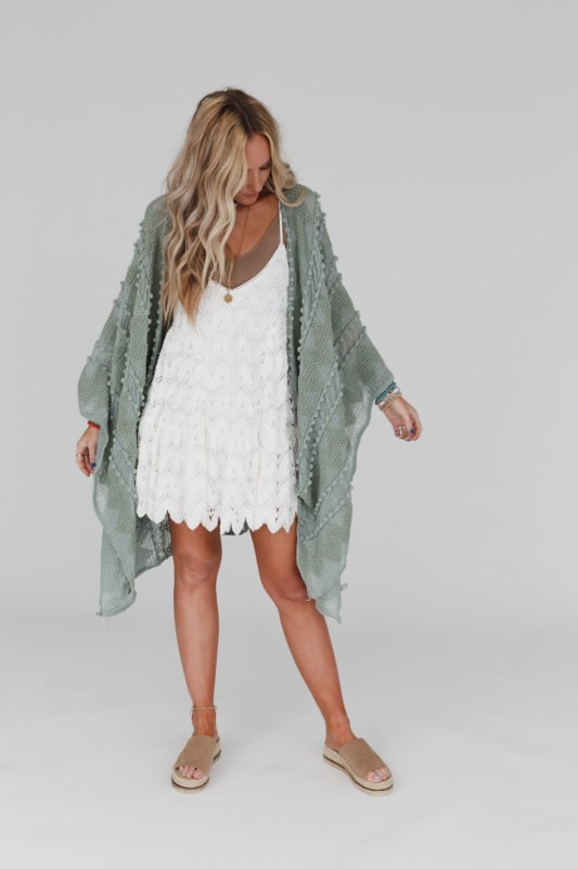 The ultimate boho kimono! It is featured in a textured lightweight fabric with round pom-pom details, an open front, poncho armhole sleeves, and side slits.