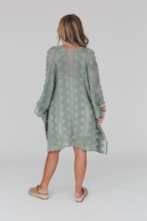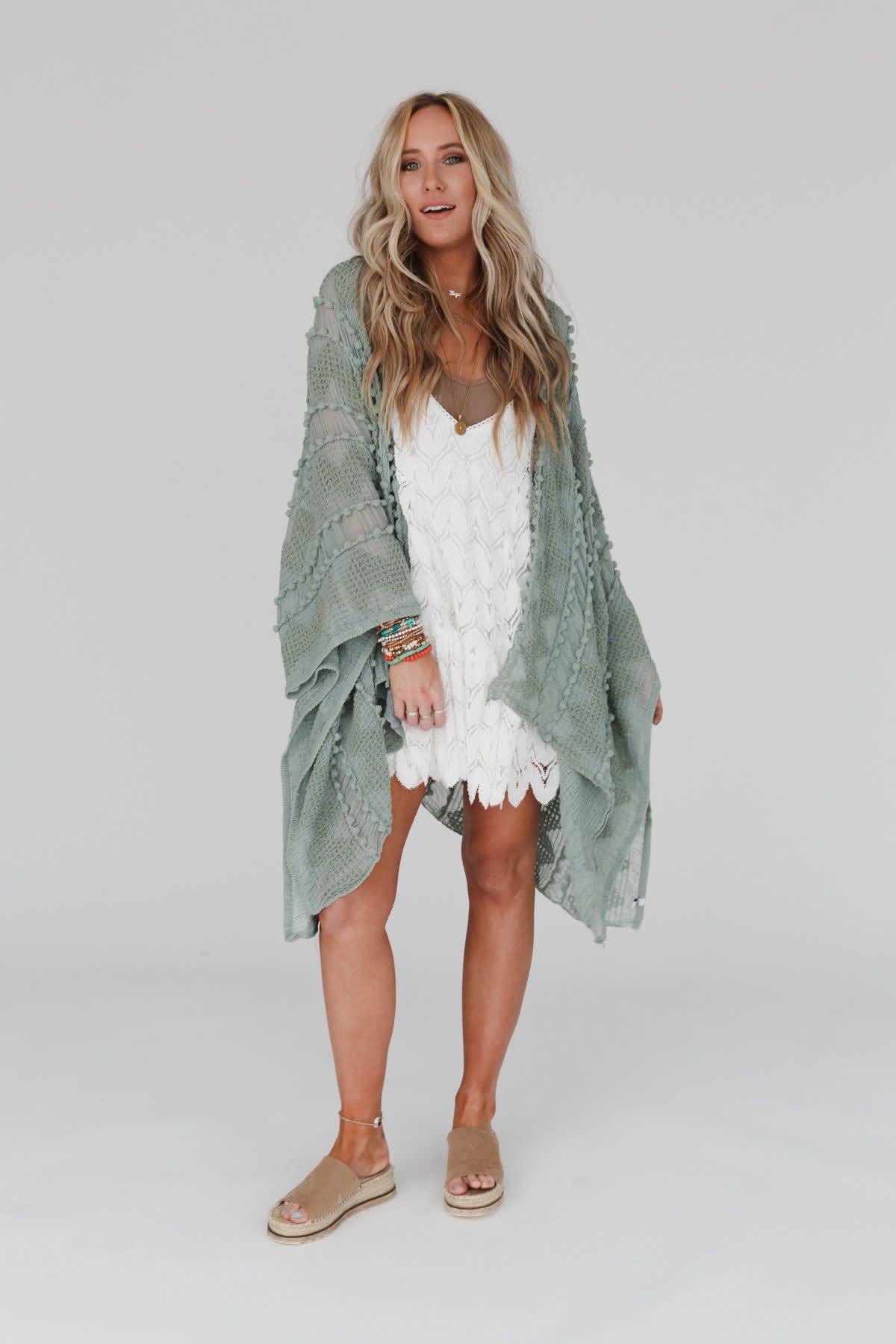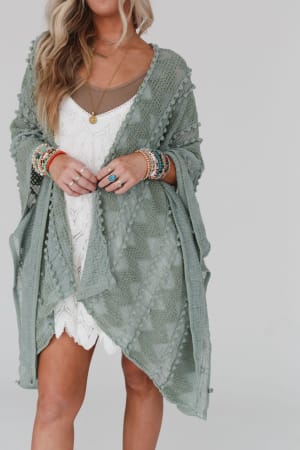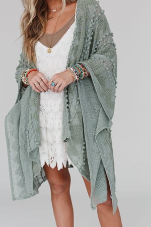 The ultimate boho kimono! It is featured in a textured lightweight fabric with round pom-pom details, an open front, poncho armhole sleeves, and side slits.