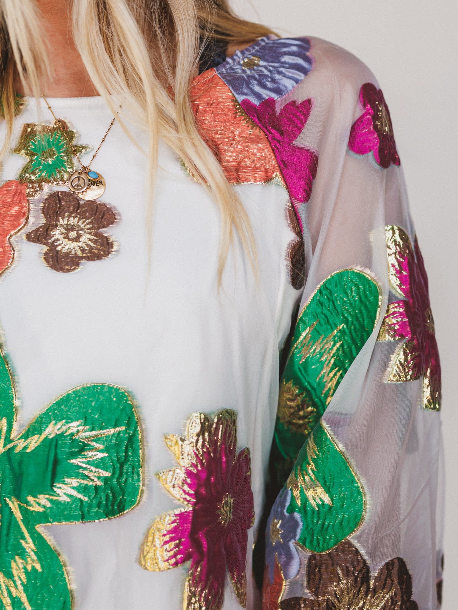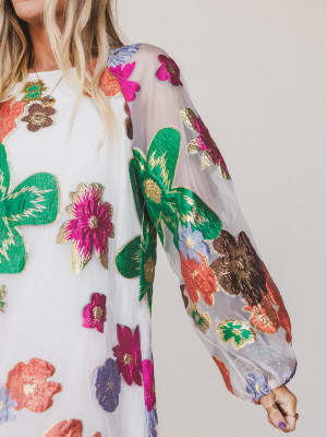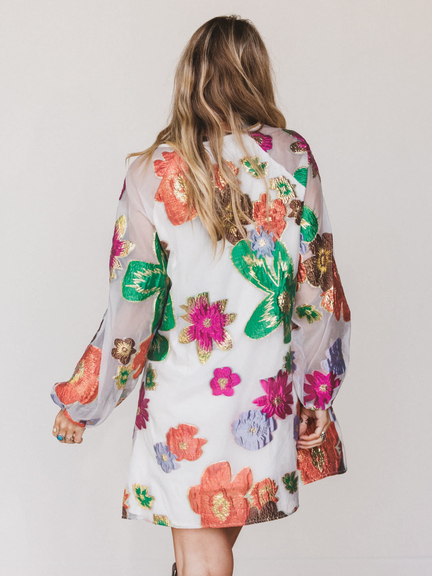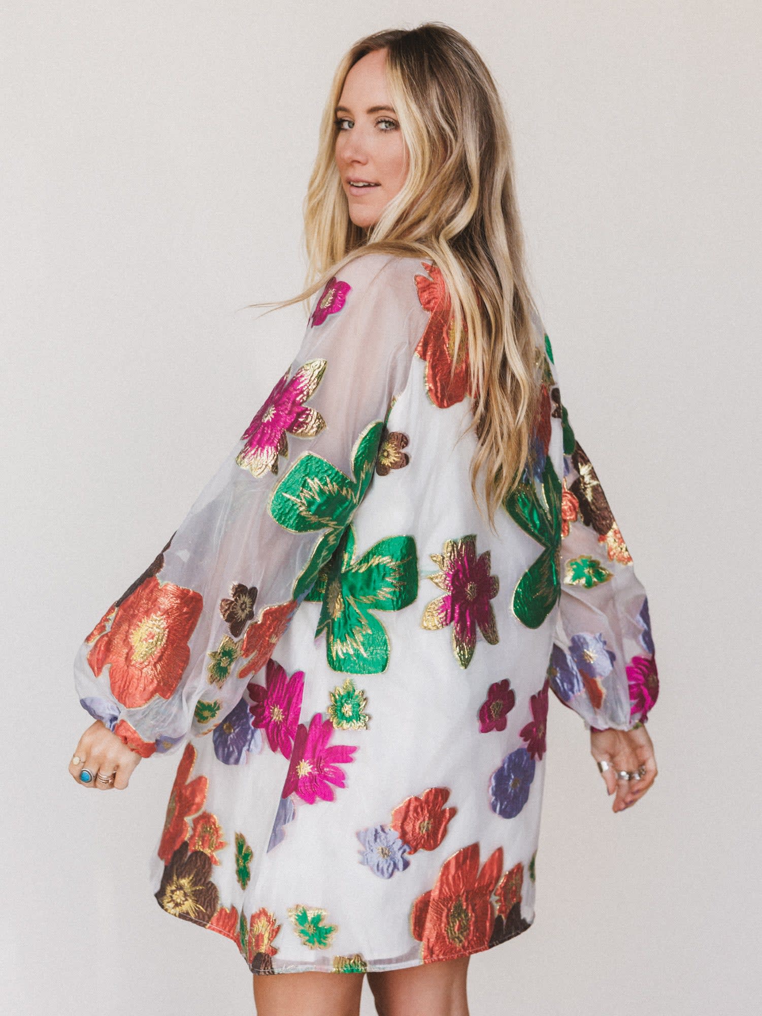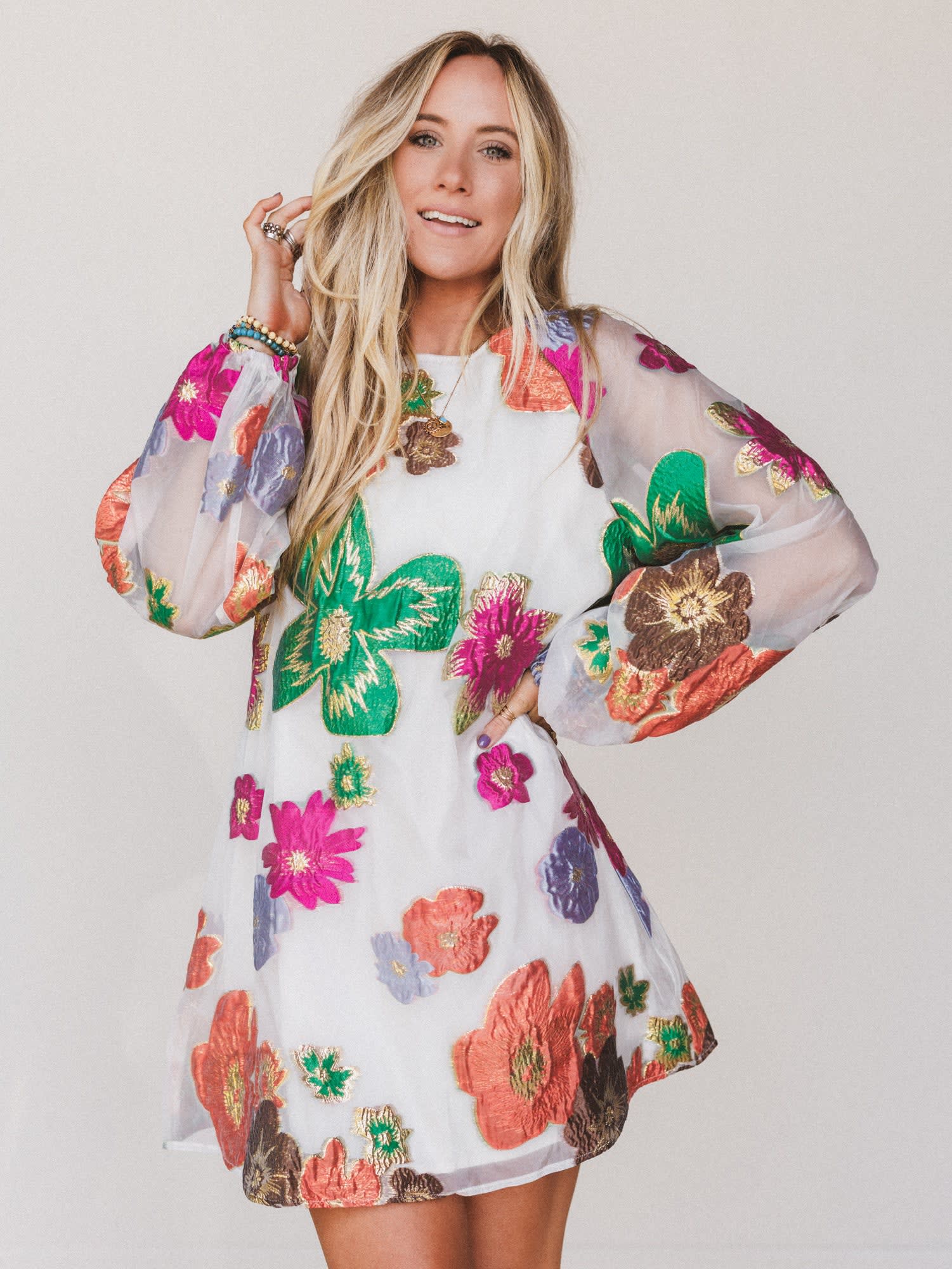 The Ballad Sky Floral Dress is pure joy in outfit form. With bold, metallic floral appliqués scattered across sheer puff sleeves and a flared silhouette, this statement mini was made to stand out—from music festivals to rooftop cocktails.