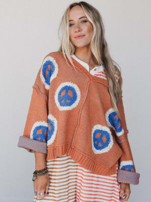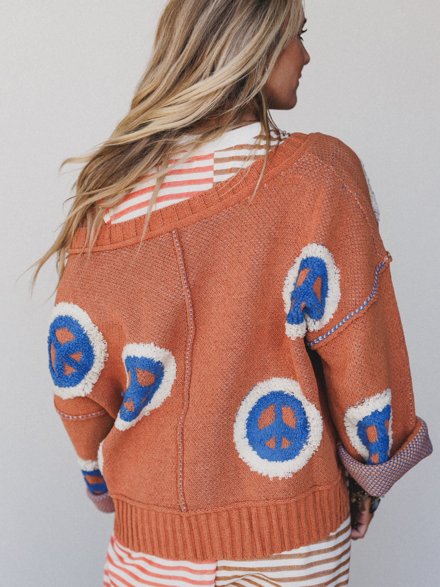- Peaceful Patterns Top: A cozy rust-colored knit with bold peace signs, this oversized sweater brings nostalgic charm and boho flair to any outfit.