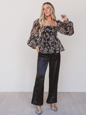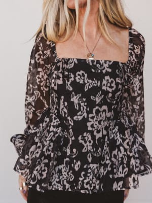 Romantic yet structured, the Bare Threads Top turns every entrance into a moment. With its smocked bodice and flouncy peplum hem, this sheer floral piece adds a bold, feminine touch to both daytime looks and night-out fits.