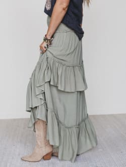 - The Washed Ashore Ruffled Maxi Skirt flows with graceful ease, offering a soft, tiered silhouette perfect for slow mornings and spontaneous twirls