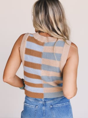 Slip into sunset vibes with the Beau Colorblock Top — where cozy knit meets coastal cool. With its dreamy palette of soft blue, warm tan, and creamy white, this sleeveless sweater tank is the perfect piece for layering up or wearing solo under the sun.