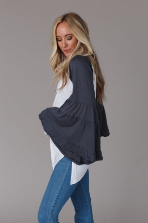 This is the one that has all the fun with the sweet style of a baseball tee, a roomy fit, and tiered flounce in these boho-chic bell sleeves. Soft knit is just right for this tunic length tee with side-slits and classic contrast at the crewneck band.