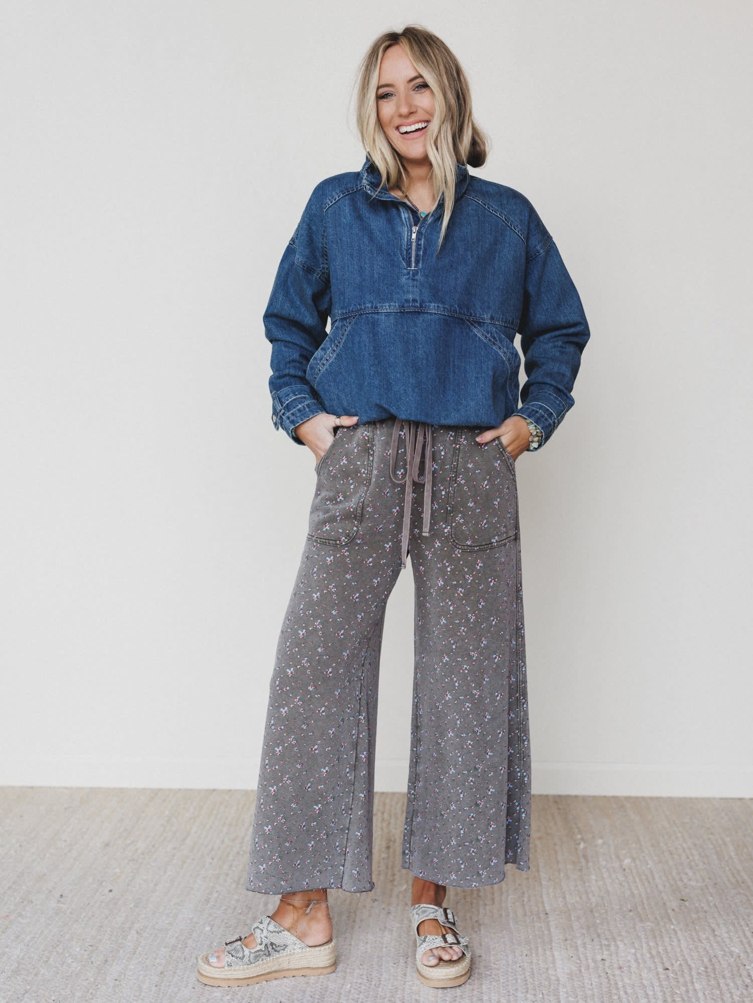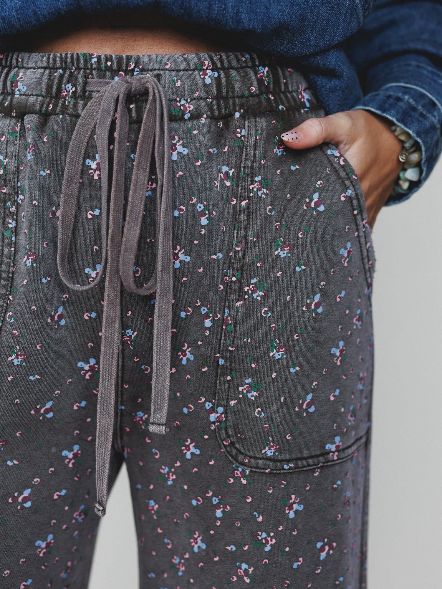- Features the Blooming Season Pants in ash olive with a soft floral print