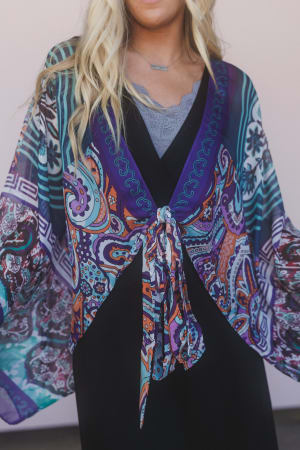 This wrap scarf top looks amazing with bell bottom jeans and boots for summer festivals.