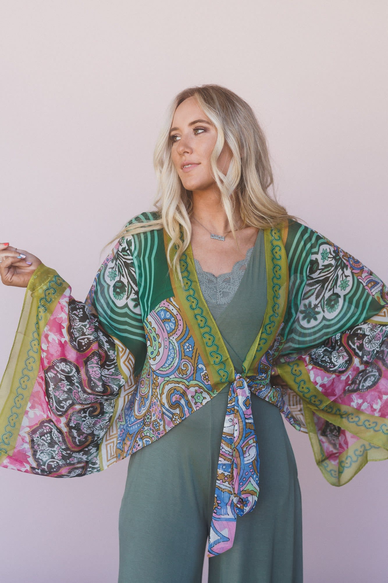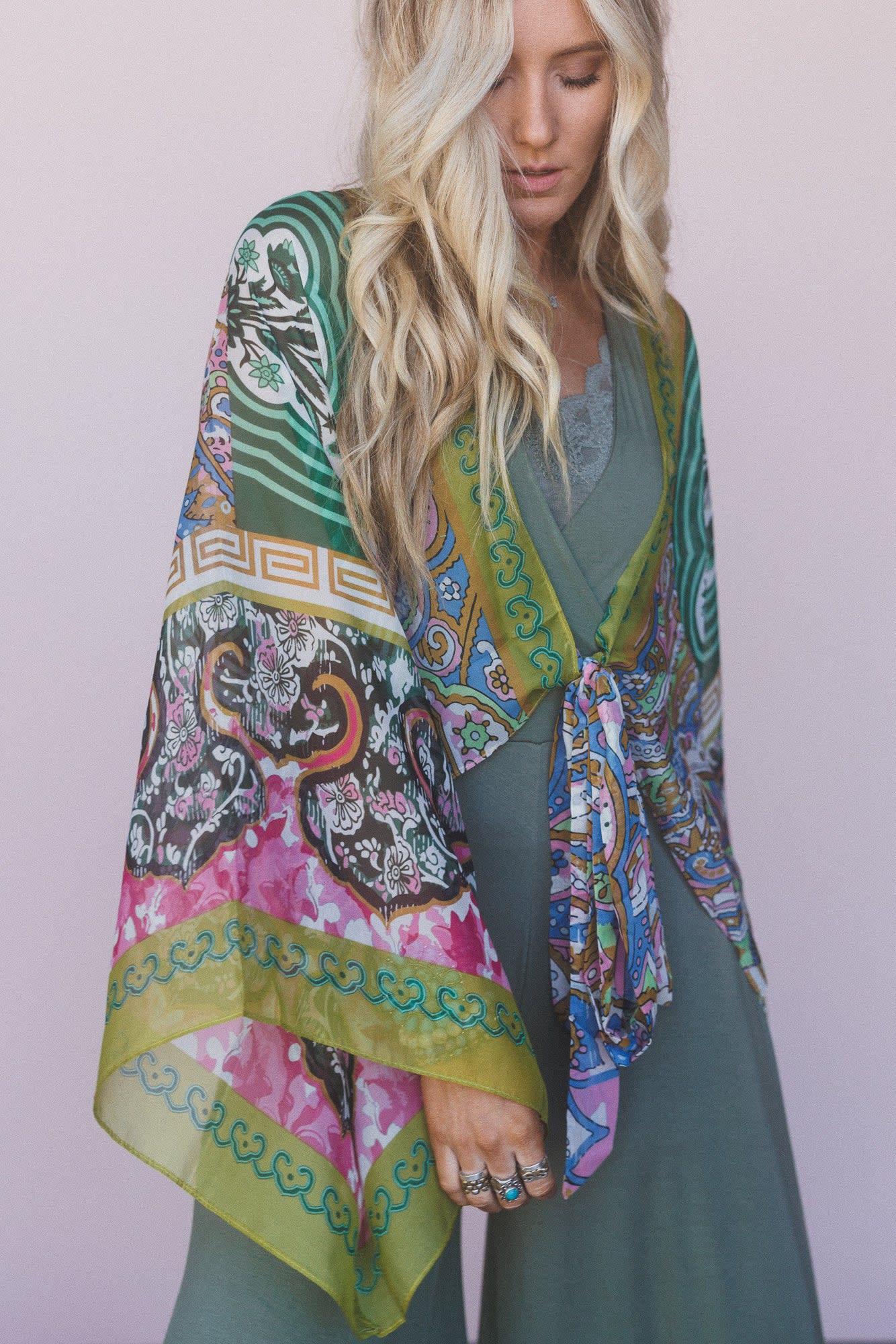 This wrap scarf top looks amazing with bell bottom jeans and boots for summer festivals.