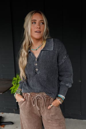 Classic collared Henley neckline with dropped shoulders, long sleeves and 3/4 button closure
