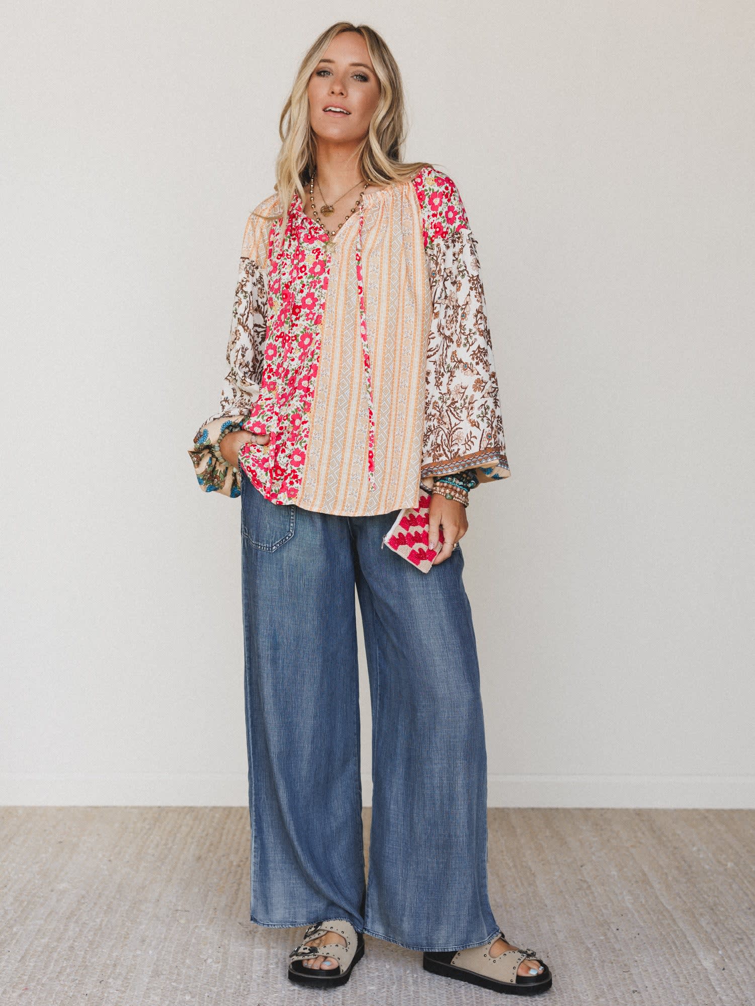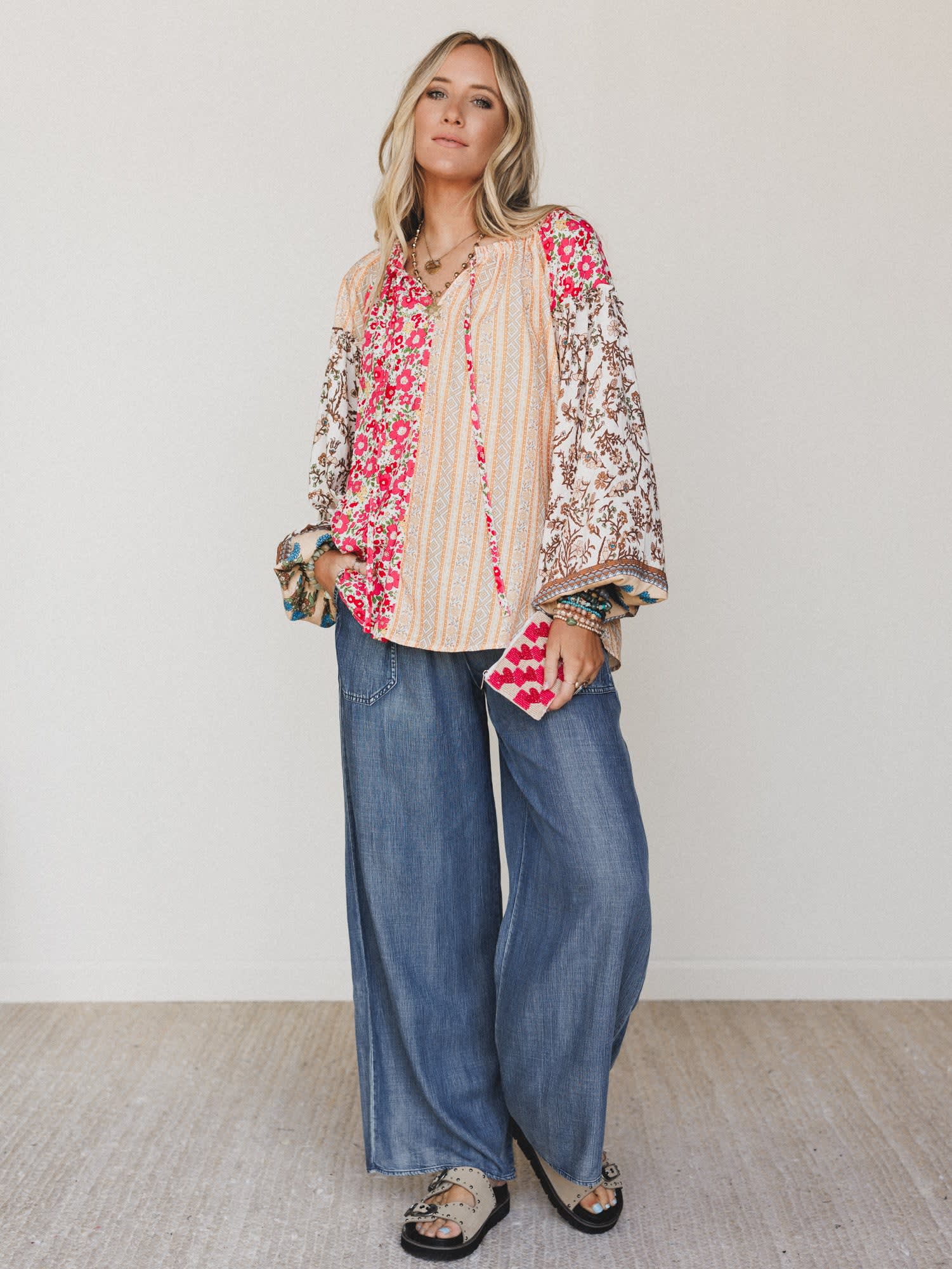 • Flowy mixed-print blouse with a relaxed fit for everyday boho styling