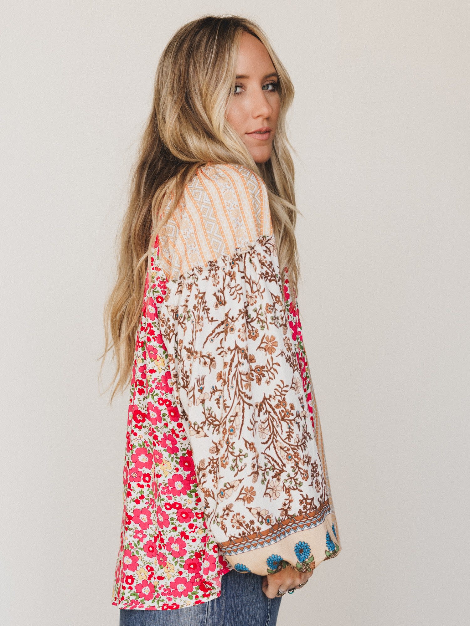 This free-spirited blouse feels like something you’d throw on for a slow morning, then keep wearing straight into dinner plans—easy, expressive, and full of boho soul.