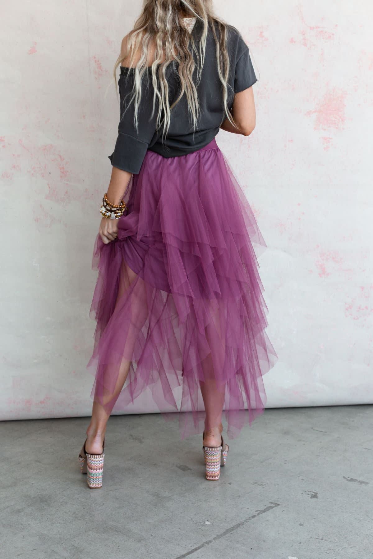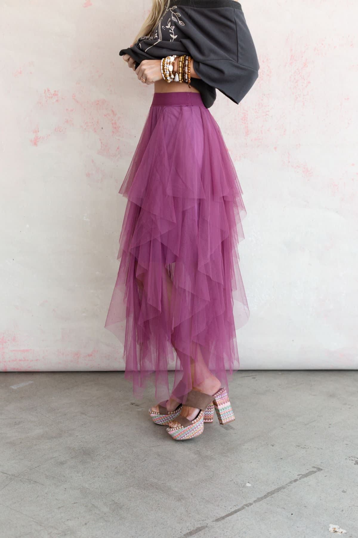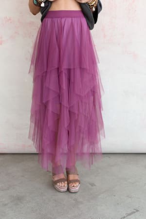 Pretty tiers of soft tulle flatter this Boho Ballerina Skirt in a romantic cascade of sugar plum fun. This skirt has a stretchy pull-on waist and partial lining to the knee with a peek-through handkerchief hemline in a trendy midi-length.